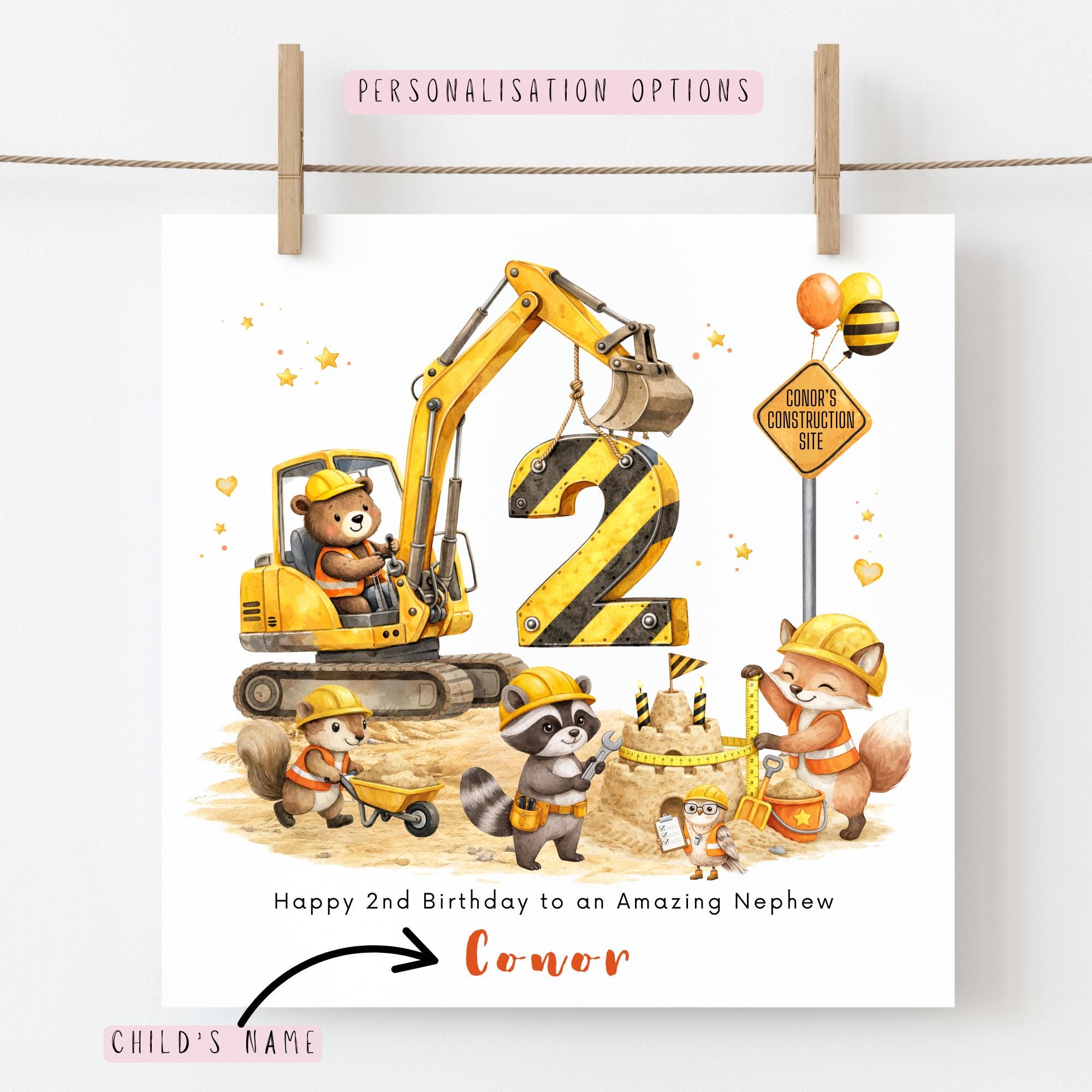 This personalised construction digger birthday card is designed to celebrate a little boy’s second birthday in a fun and memorable way. With its cheerful building site scene, woodland animals and personalised details, it becomes a lovely keepsake to treasure for years to come.