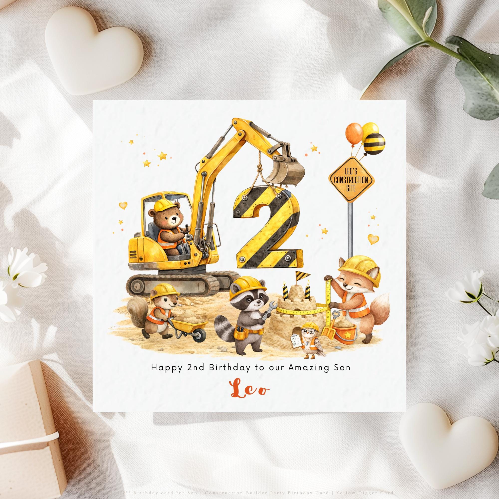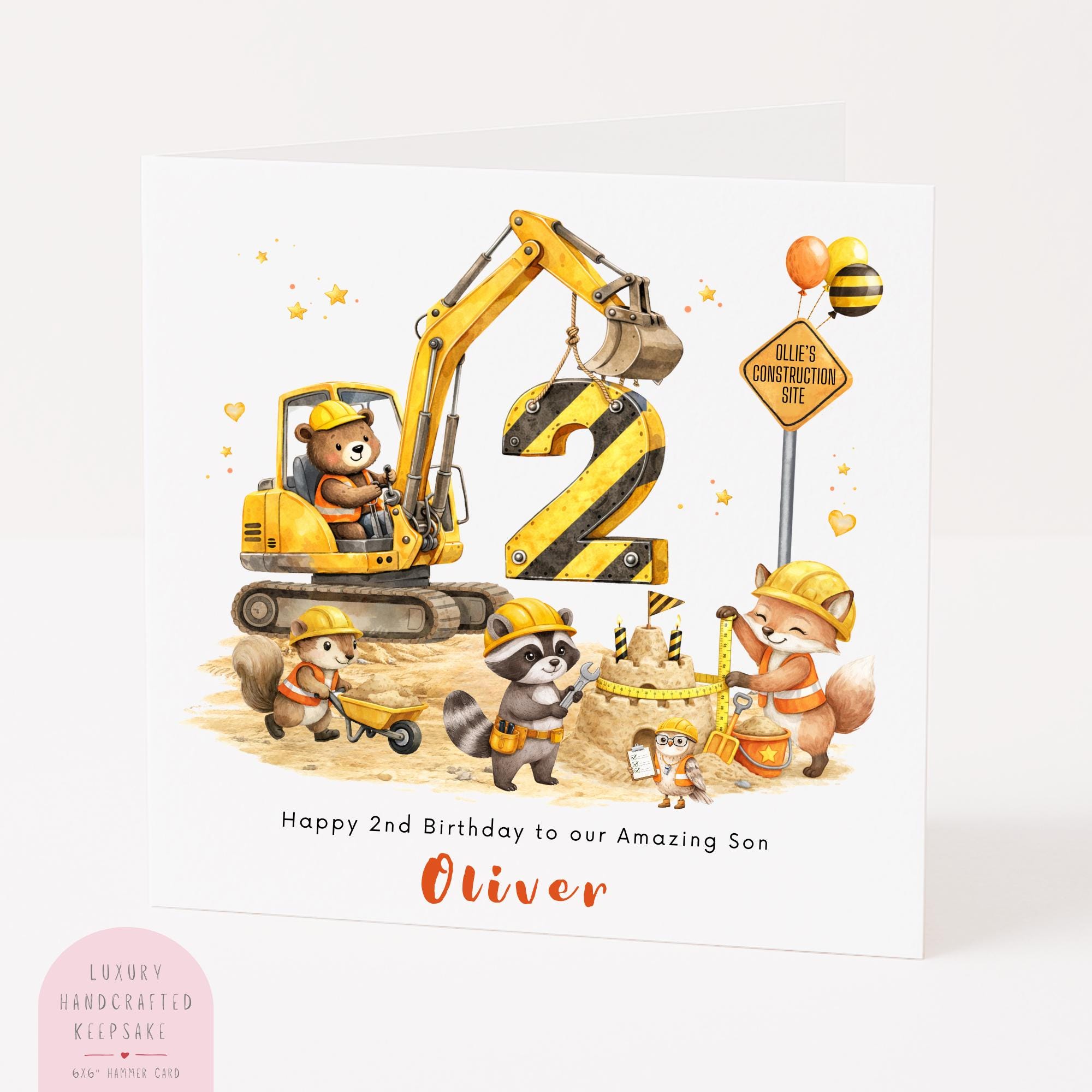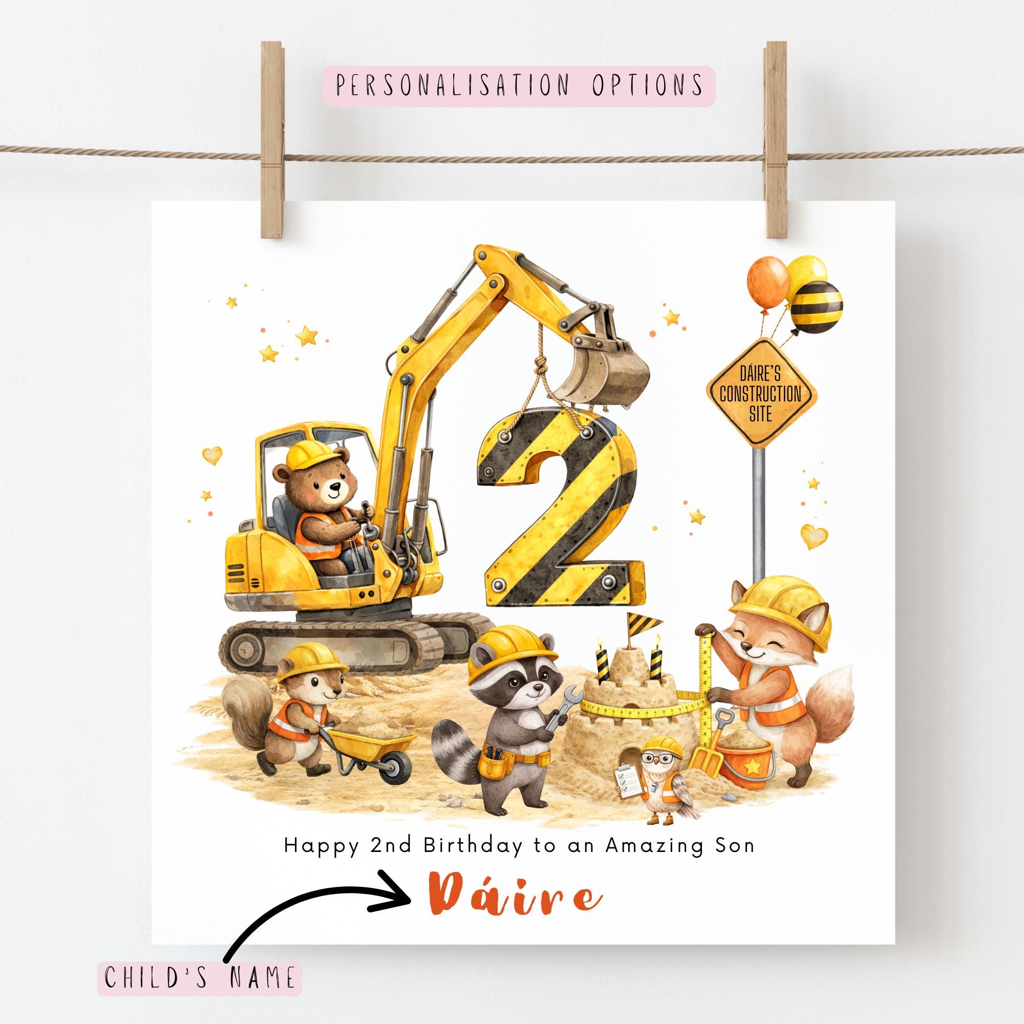 Personalised 2nd Birthday Card for Son – Construction Digger Birthday Card – Excavator Builder Card – Building Site Keepsake – Custom Name
