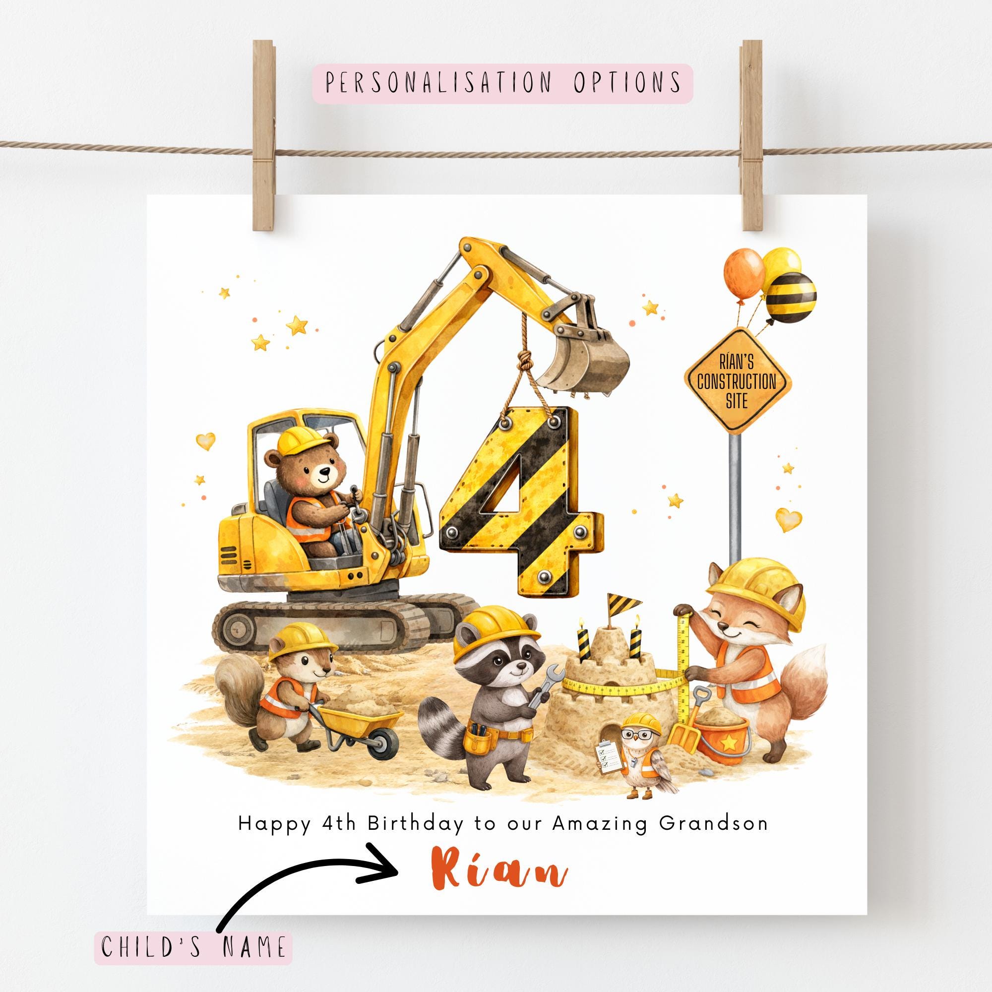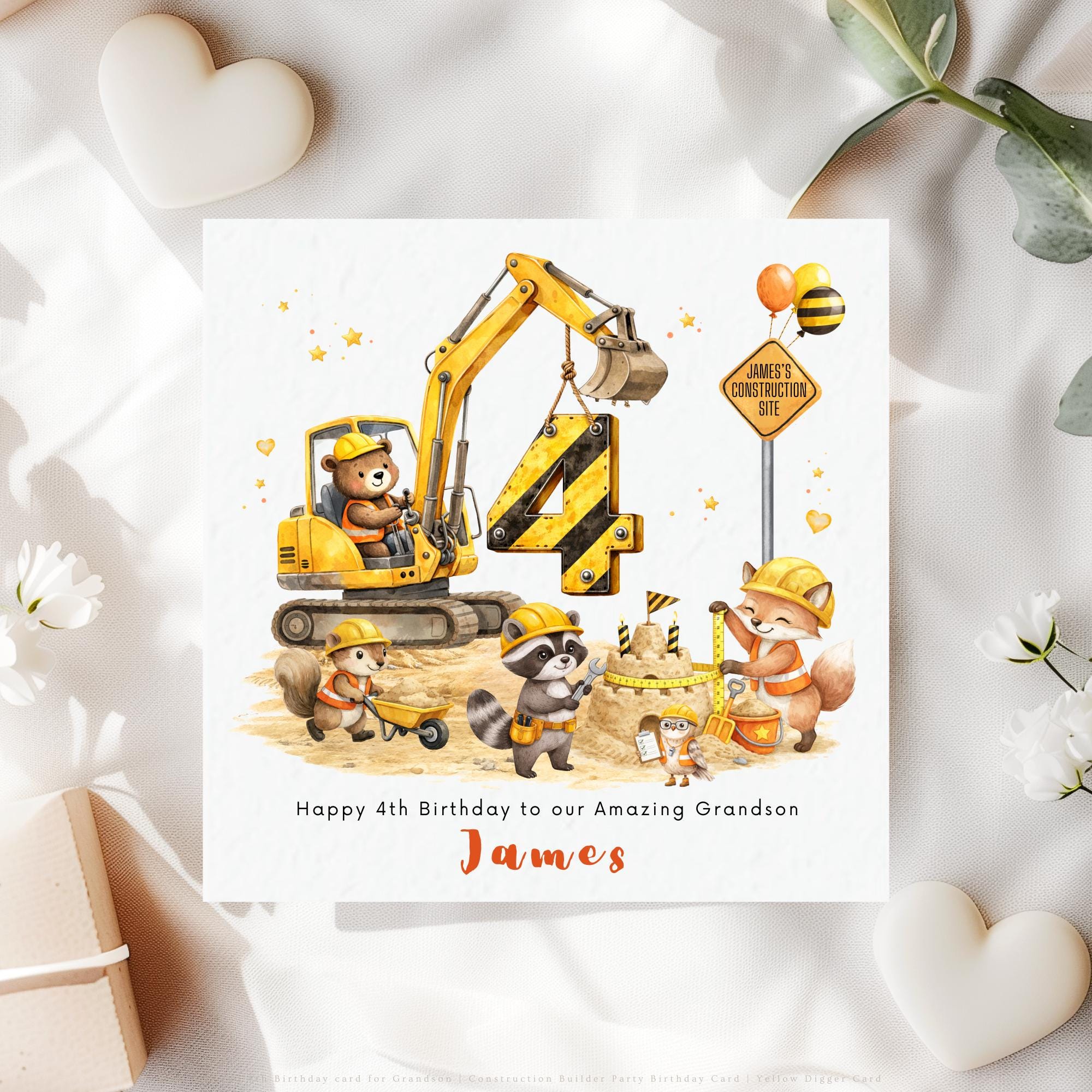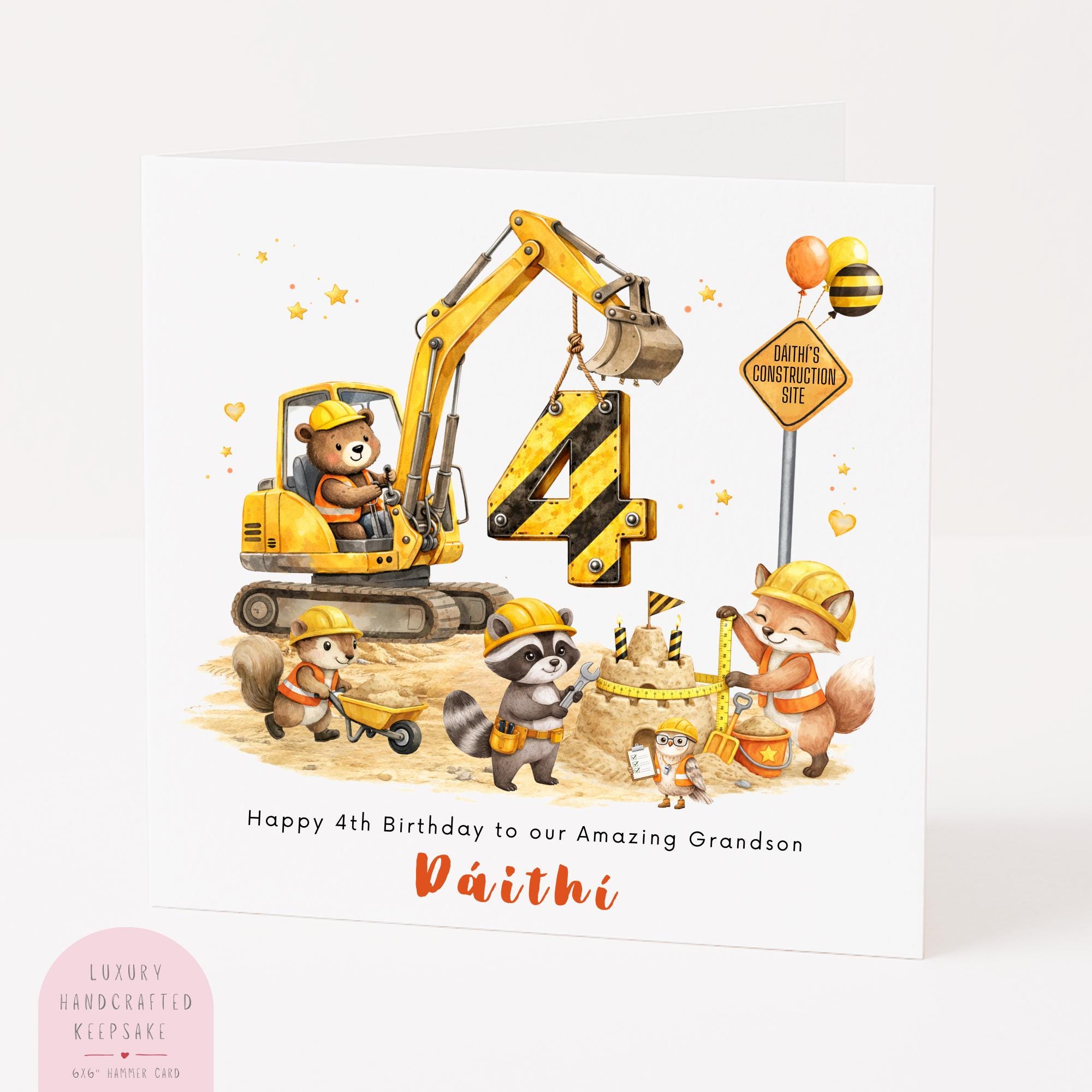 This personalised construction digger birthday card for your grandson is designed to celebrate his fourth birthday in a fun and meaningful way. With its cheerful building site scene, woodland animals and personalised details, it becomes a beautiful keepsake that grandparents and family will treasure for years to come.