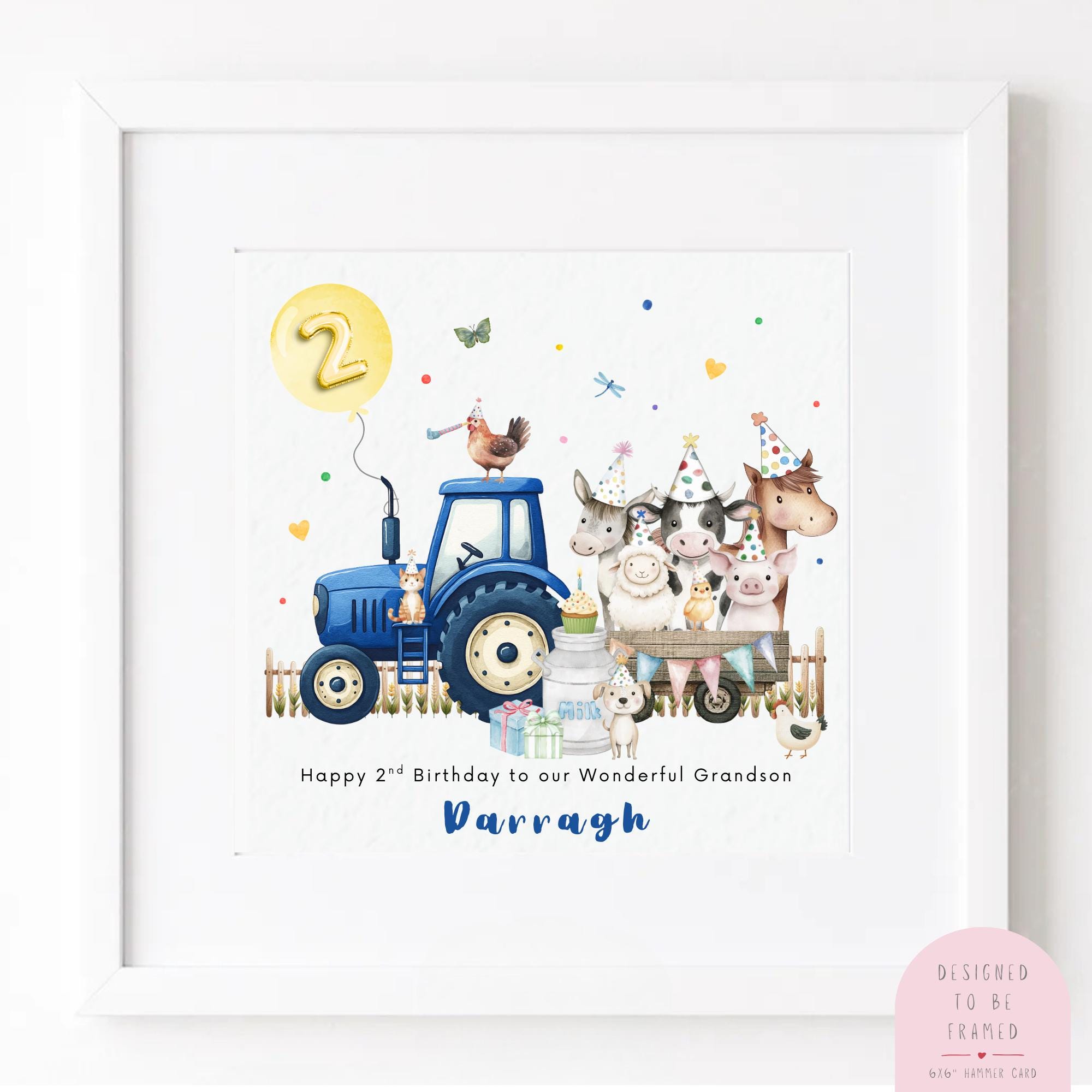 The design features a delightful blue tractor pulling a farmyard party trailer filled with friendly farm animals, including a cow, sheep, pig, donkey and horse all wearing colourful birthday hats. With bunting, balloons, gifts and confetti, this playful farmyard scene captures the fun of a farm animal themed second birthday party.