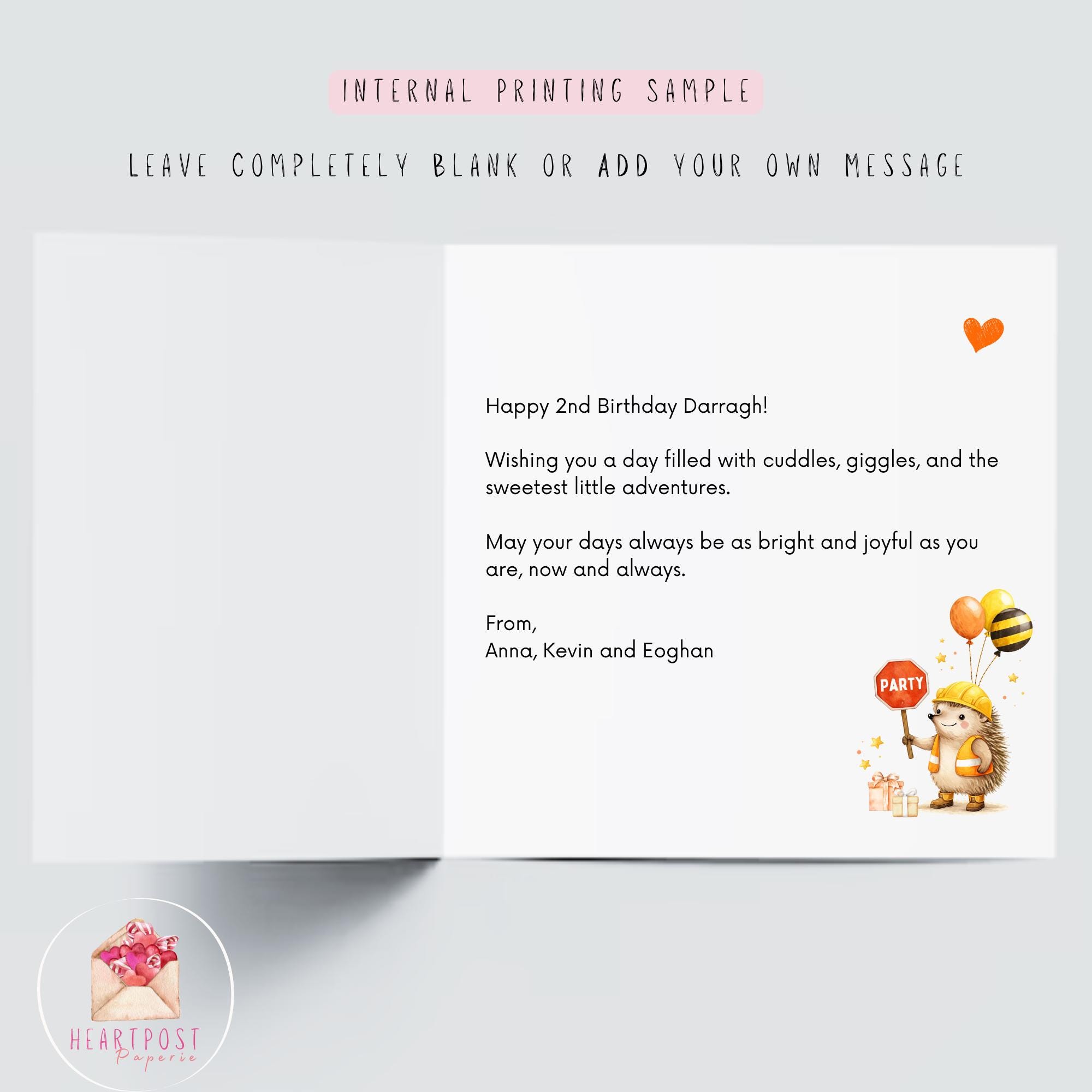 This personalised digger construction birthday card is more than just a card — it’s a special keepsake designed to celebrate a little boy’s second birthday in a fun and meaningful way. With its cheerful construction scene, adorable characters, and personalised details, it’s a thoughtful way to mark this milestone and create a memory to treasure for years to come