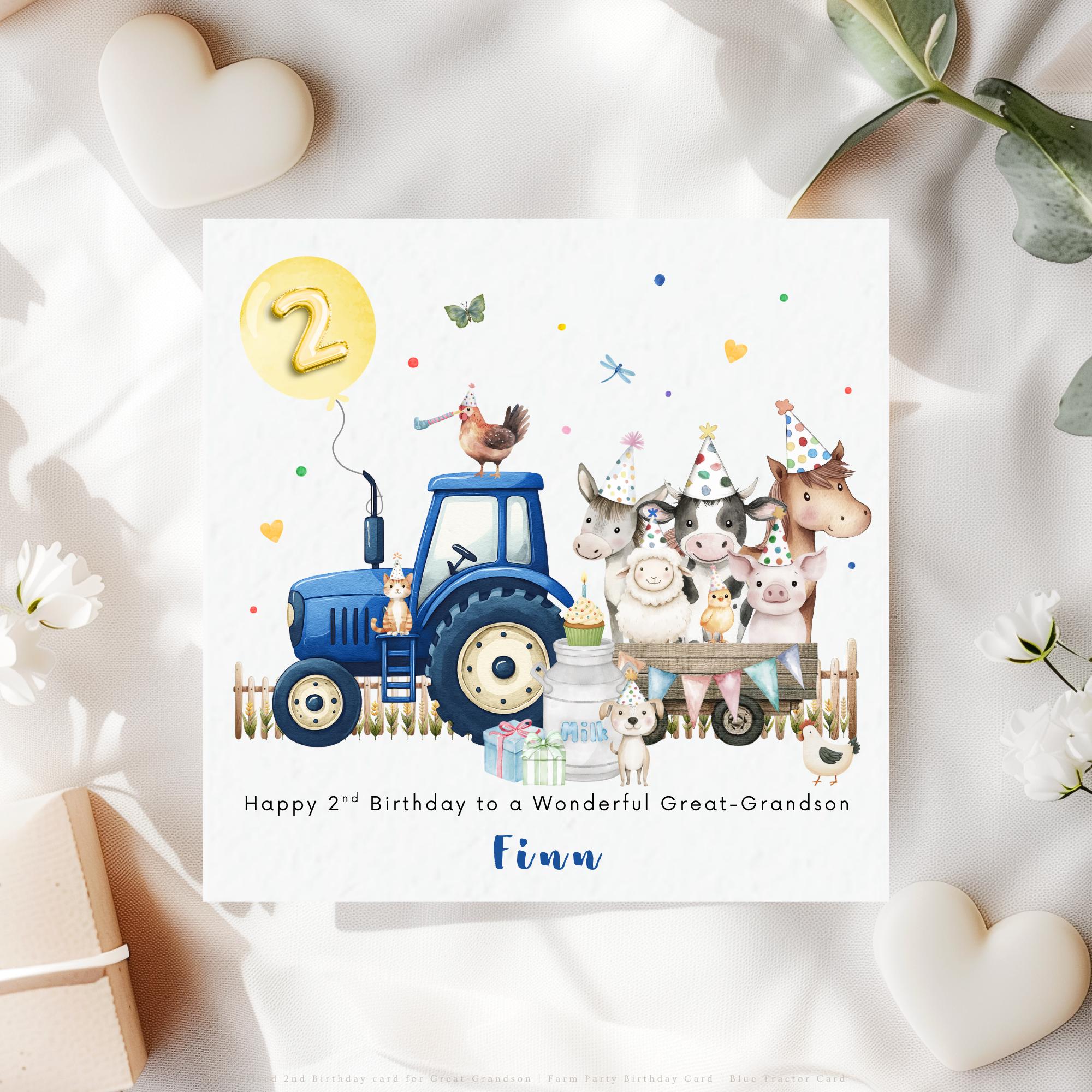 A personalised 2nd birthday card for your great-grandson from great-grandparents, featuring a charming blue tractor and farm animal birthday party illustration. This personalised great-grandson birthday card is a sweet keepsake created especially to celebrate his second birthday and the joy he brings to your family.