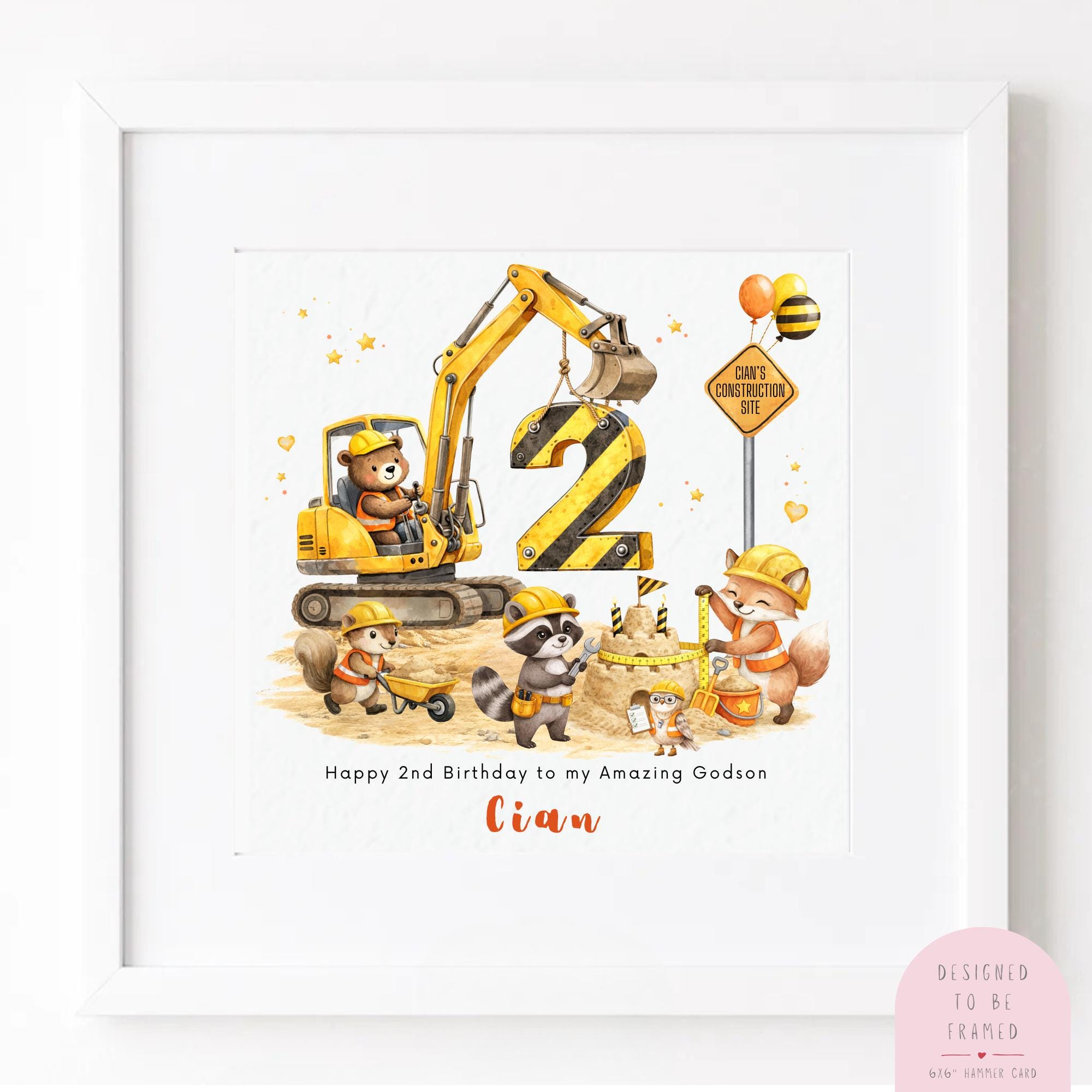 This personalised construction digger birthday card for your godson is designed to celebrate his second birthday in a fun and meaningful way. With its cheerful building site scene, woodland animals and personalised details, it becomes a beautiful keepsake that godparents and family will treasure for years to come.