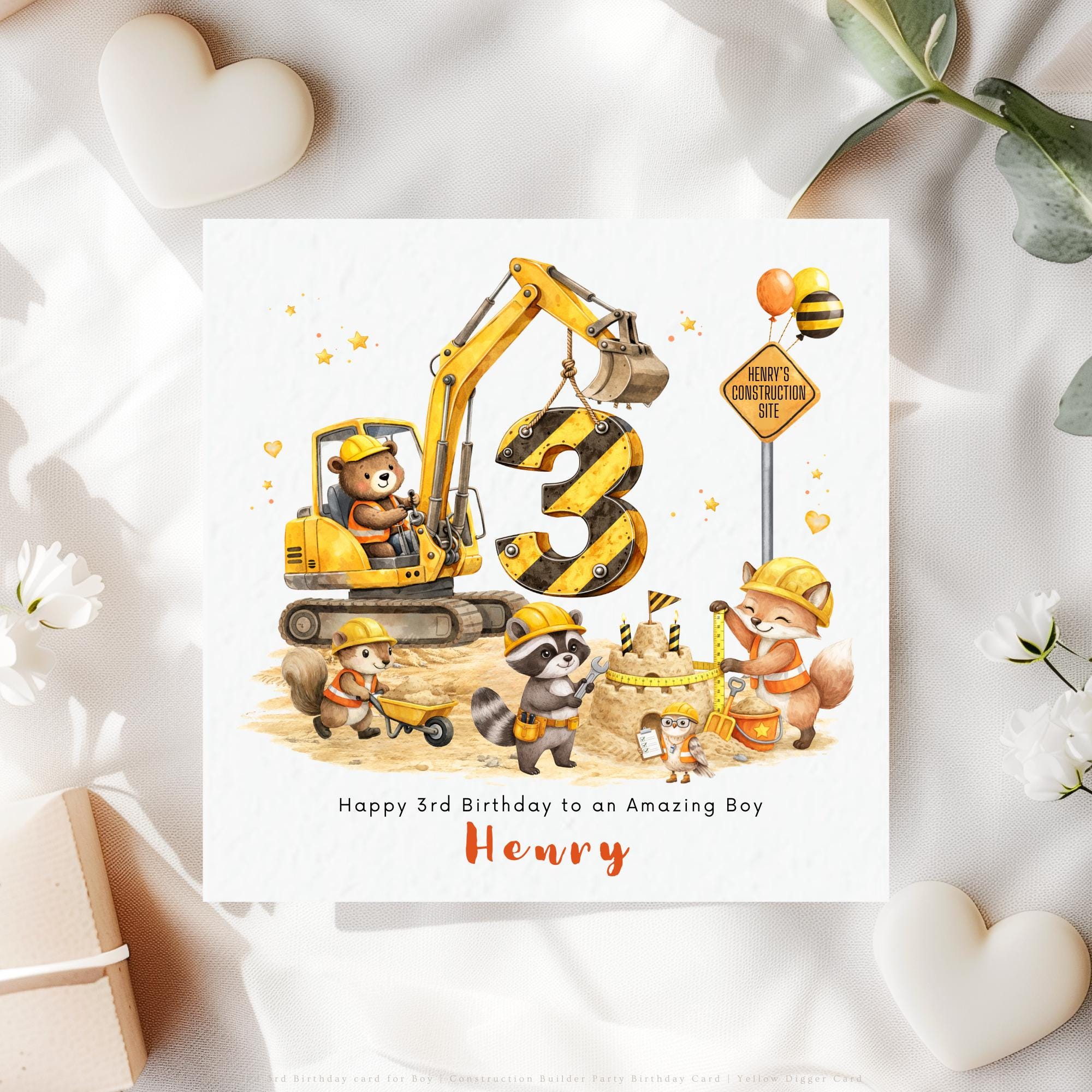 This personalised digger construction birthday card is more than just a card — it’s a special keepsake designed to celebrate a little boy’s third birthday in a fun and meaningful way. With its cheerful construction scene, adorable characters, and personalised details, it’s a thoughtful way to mark this milestone and create a memory to treasure for years to come