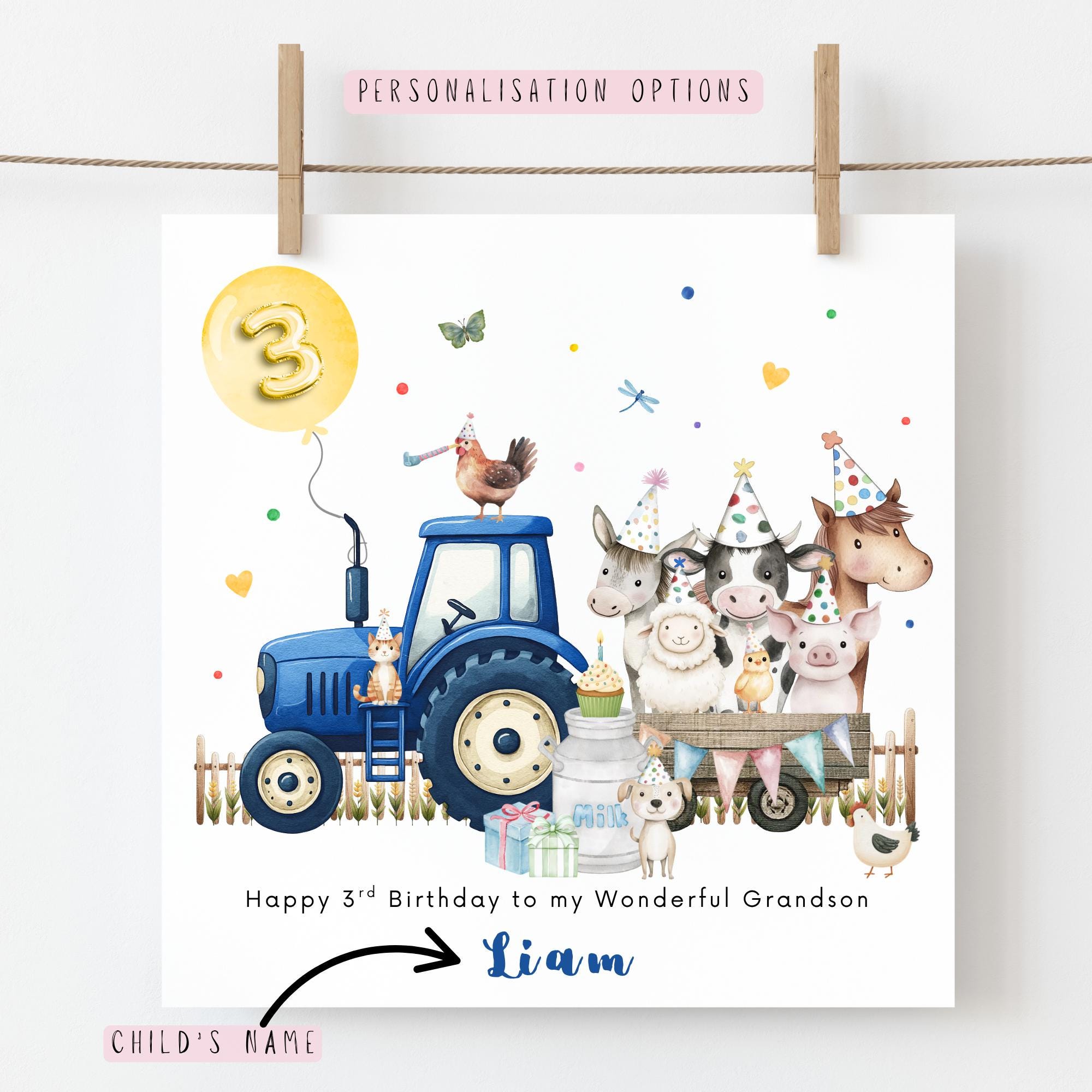 A personalised 3rd birthday card for grandson from grandparents, featuring a charming blue tractor and farm animal birthday party illustration. This personalised grandson birthday card is a sweet keepsake created especially to celebrate your grandson’s second birthday and the joy he brings to your family.