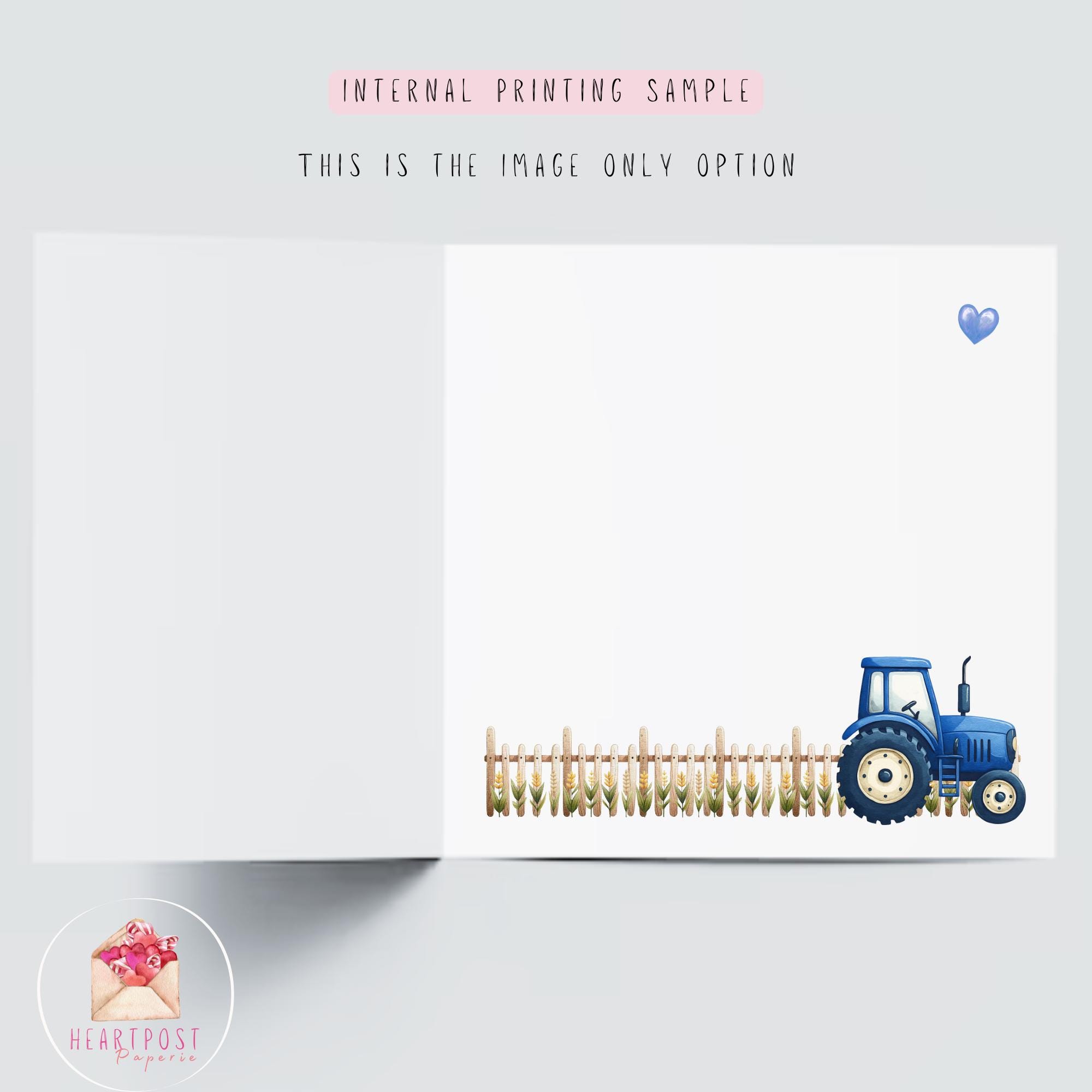 A personalised 3rd birthday card for a special little boy, featuring a charming blue tractor and farm animal birthday party illustration. This personalised farm birthday card is a sweet keepsake designed to celebrate a little one turning three in a fun and meaningful way.