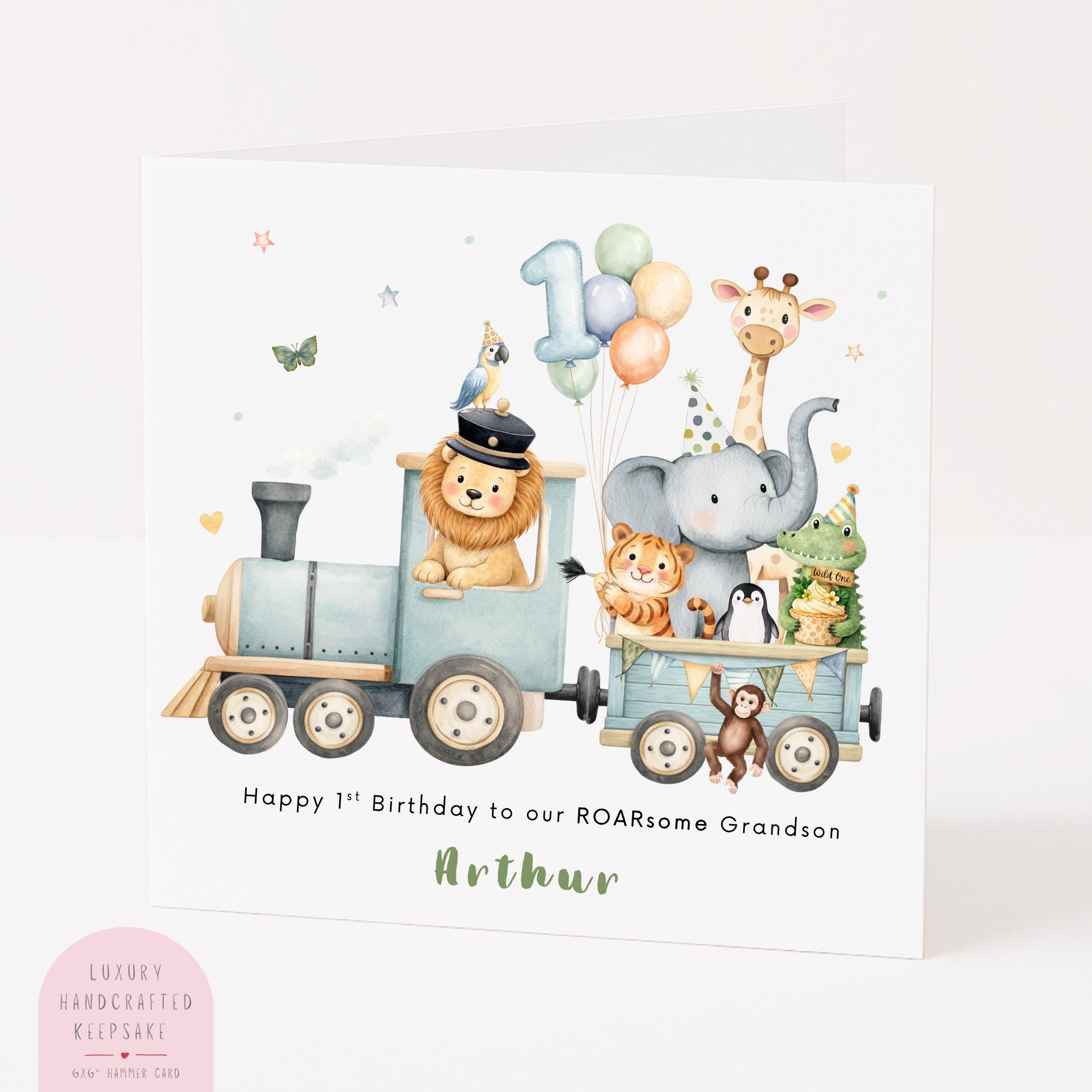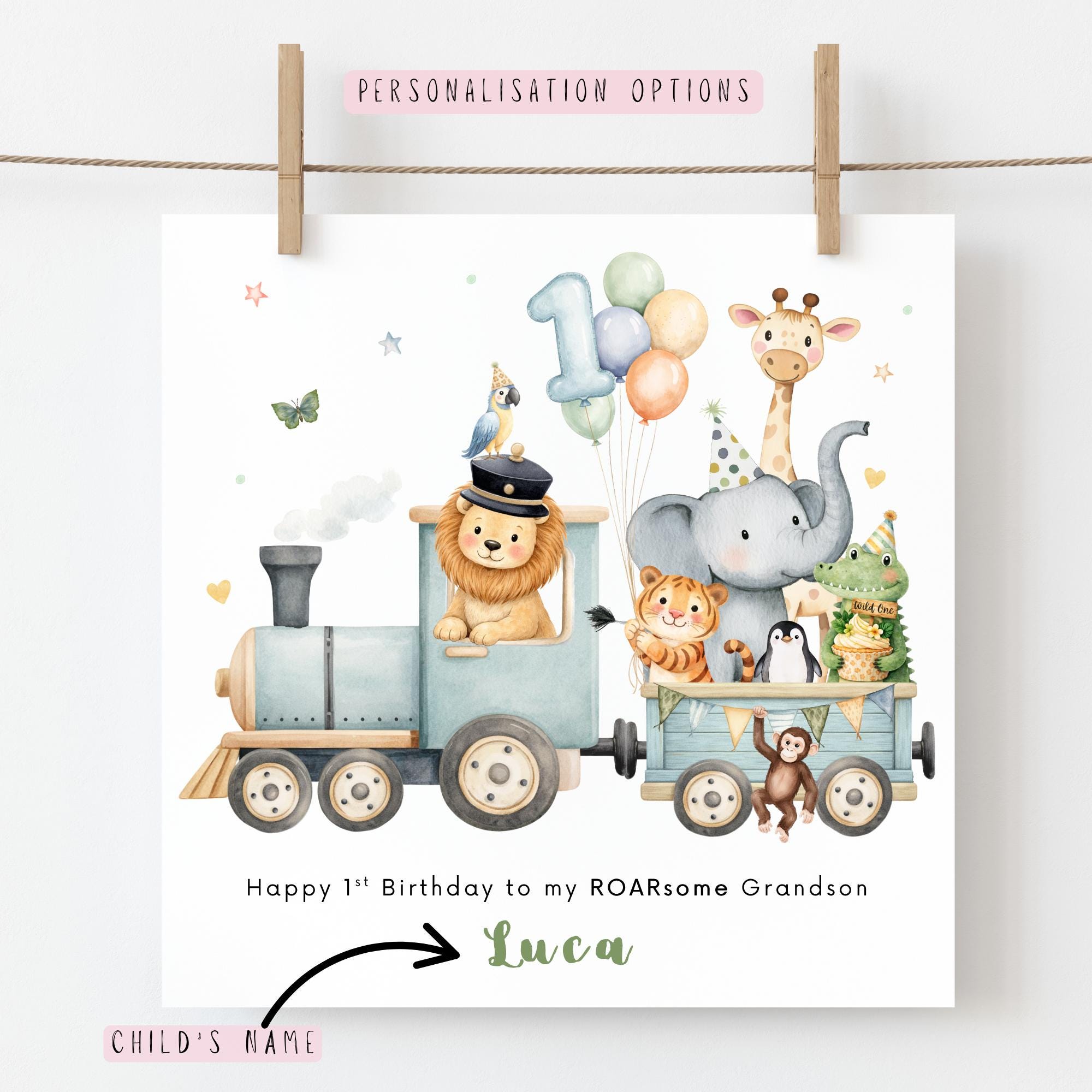 Personalised 1st Birthday Card for Grandson from Grandparents – Safari Train Birthday Card – Jungle Animal Birthday Card – Wild One Birthday Card – Zoo Animal Keepsake Card