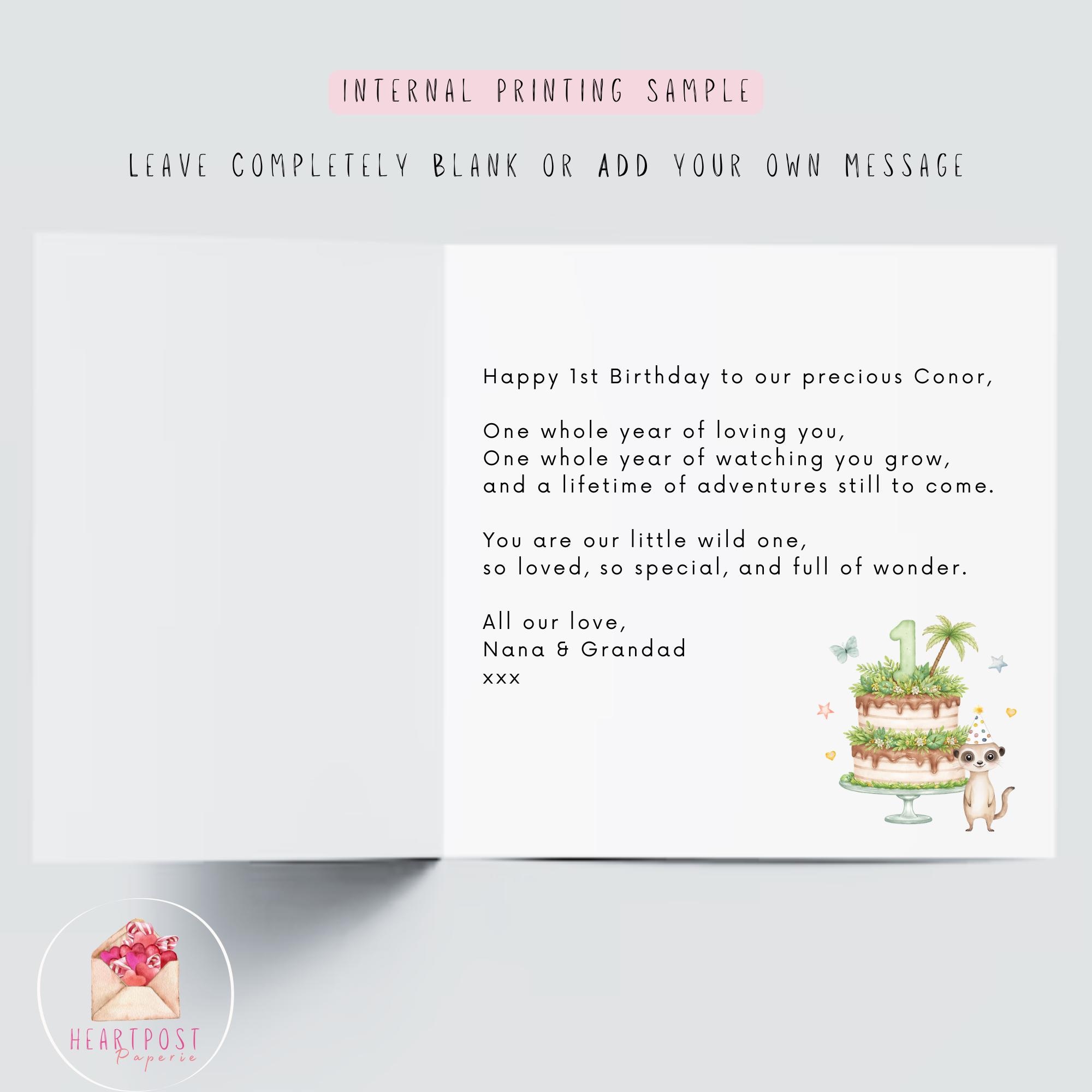 Perfect for little boys who love animals, safari adventures, and zoo themes, this personalised birthday card becomes a treasured keepsake to remember his first milestone.