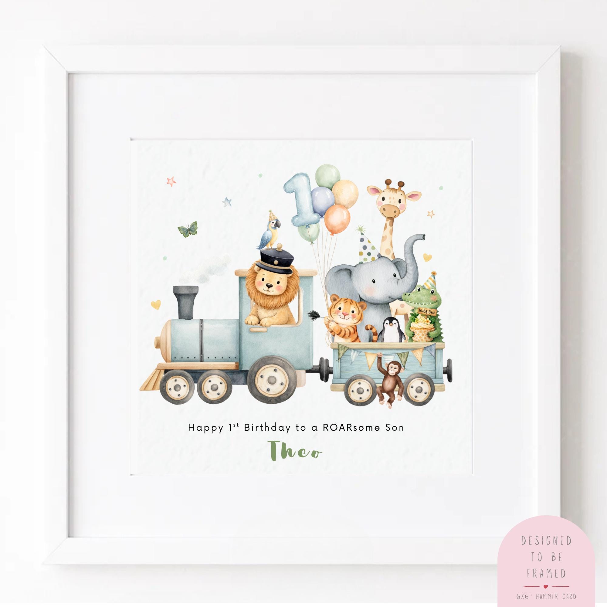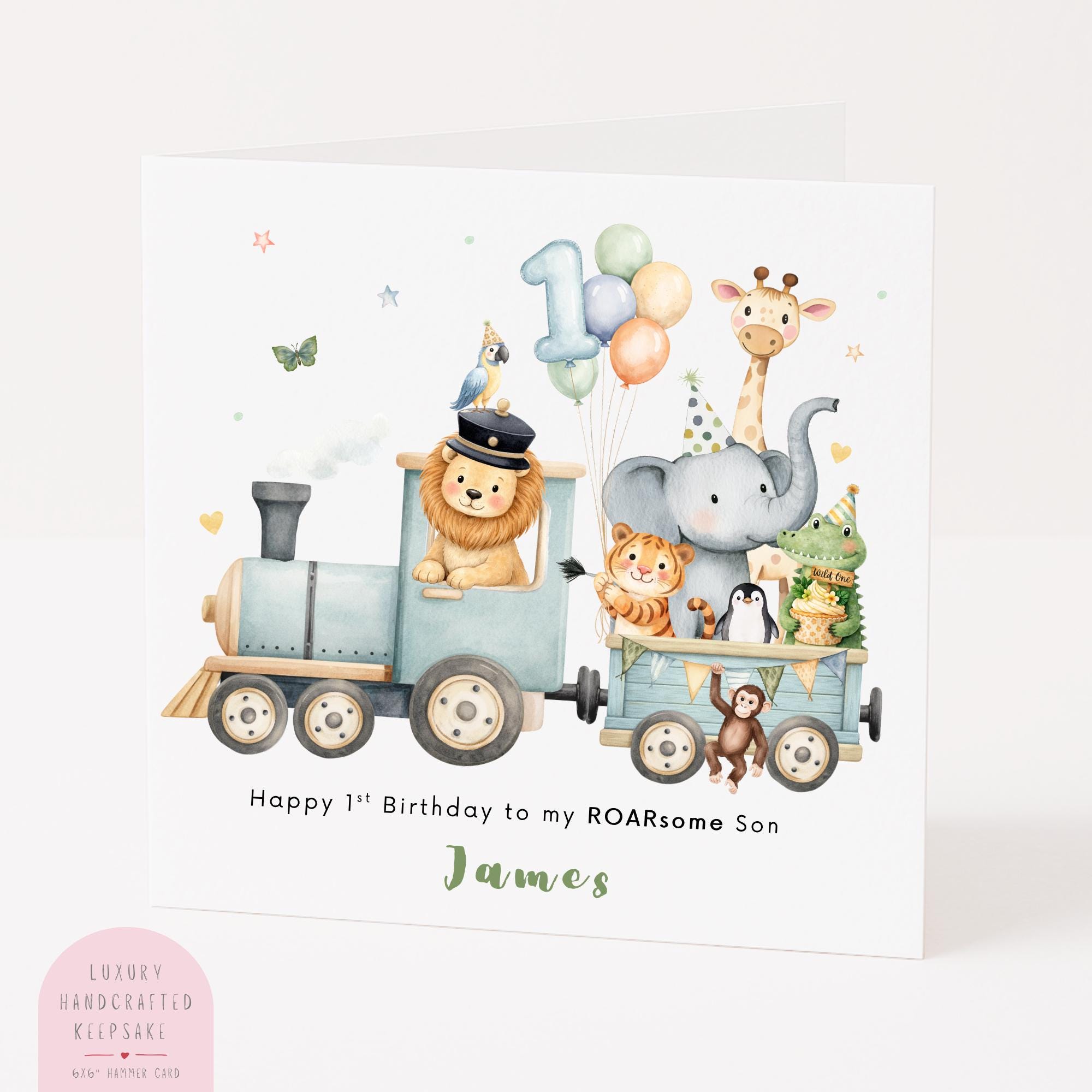 Personalised 1st Birthday Card for Son – Safari Train Birthday Card – Jungle Animal Birthday Card – Wild One Birthday Card – Zoo Animal Keepsake Card
