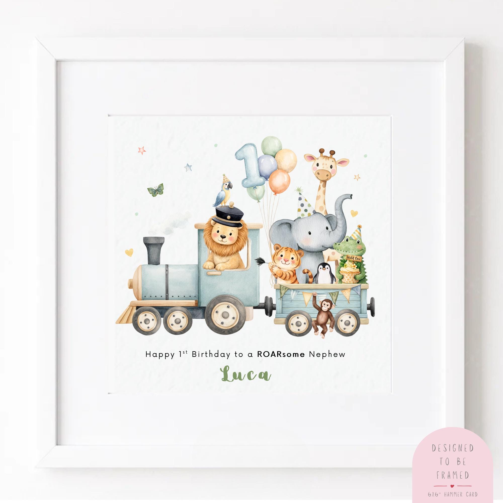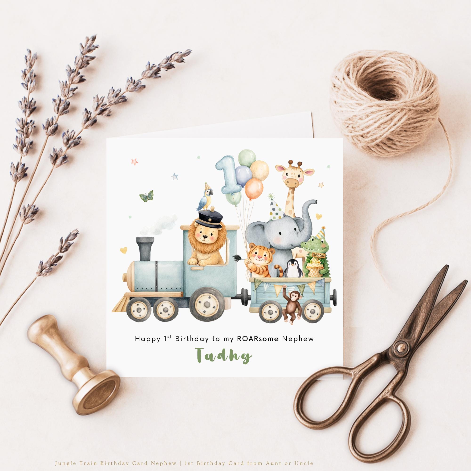 Personalised 1st Birthday Card for Nephew – Safari Train Birthday Card – Jungle Animal Birthday Card – Wild One Birthday Card – Zoo Animal Keepsake Card