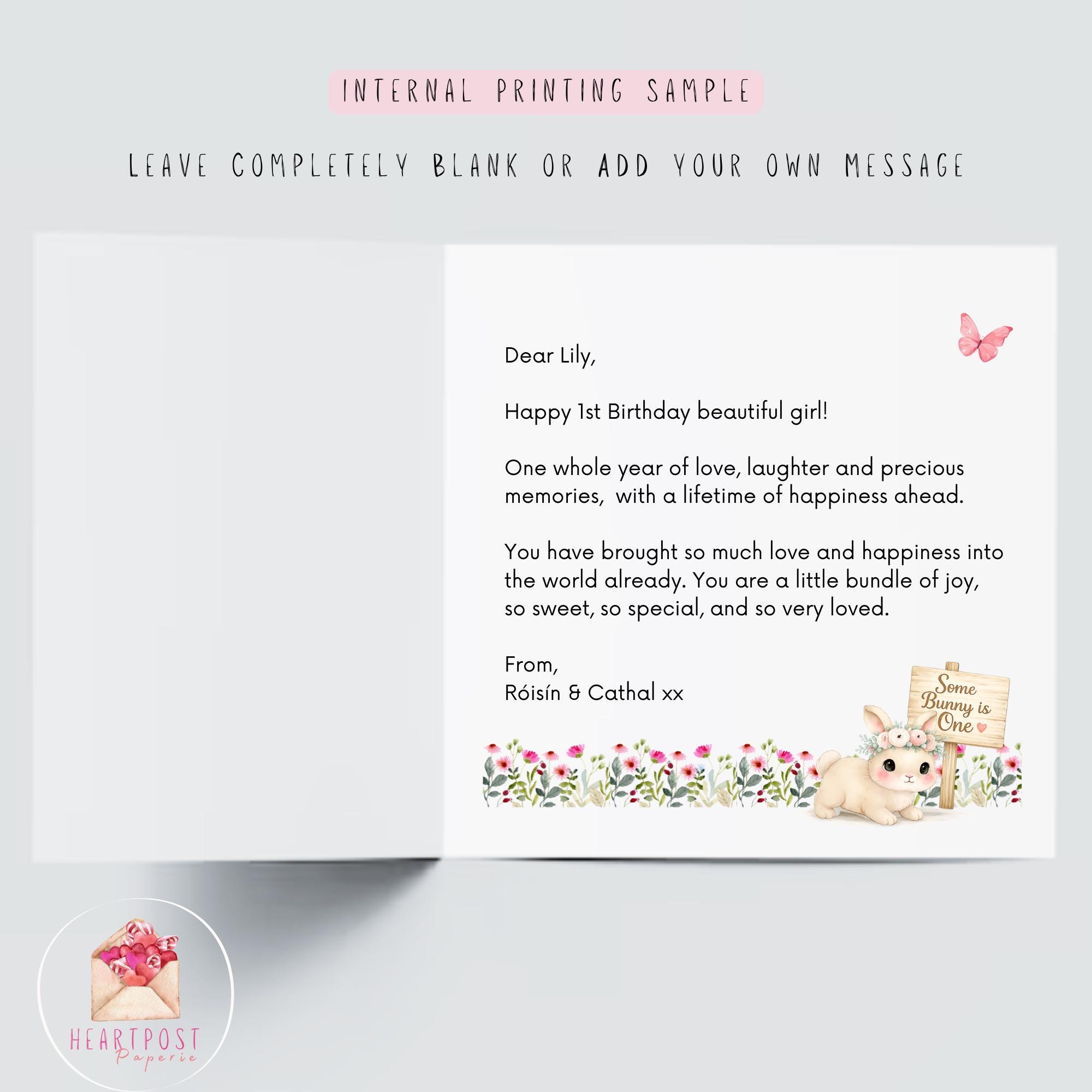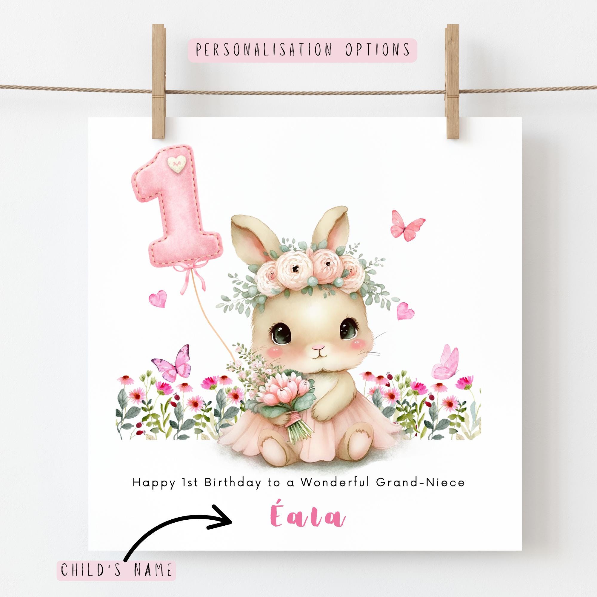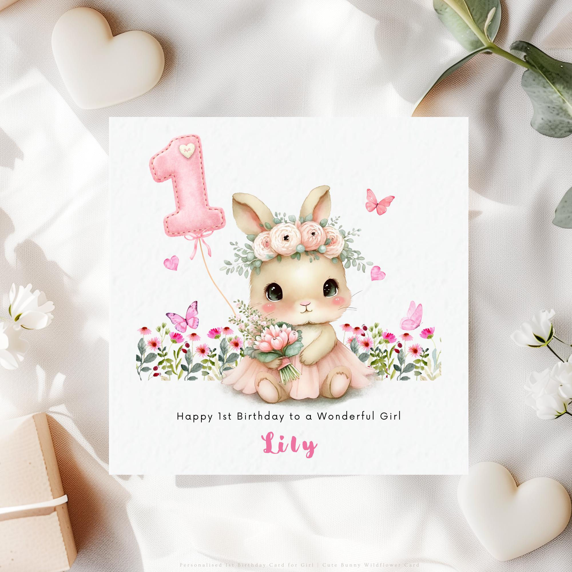 Perfect for little girls who love bunnies, flowers, and soft feminine designs, this personalised birthday card becomes a treasured keepsake to remember her very first birthday.