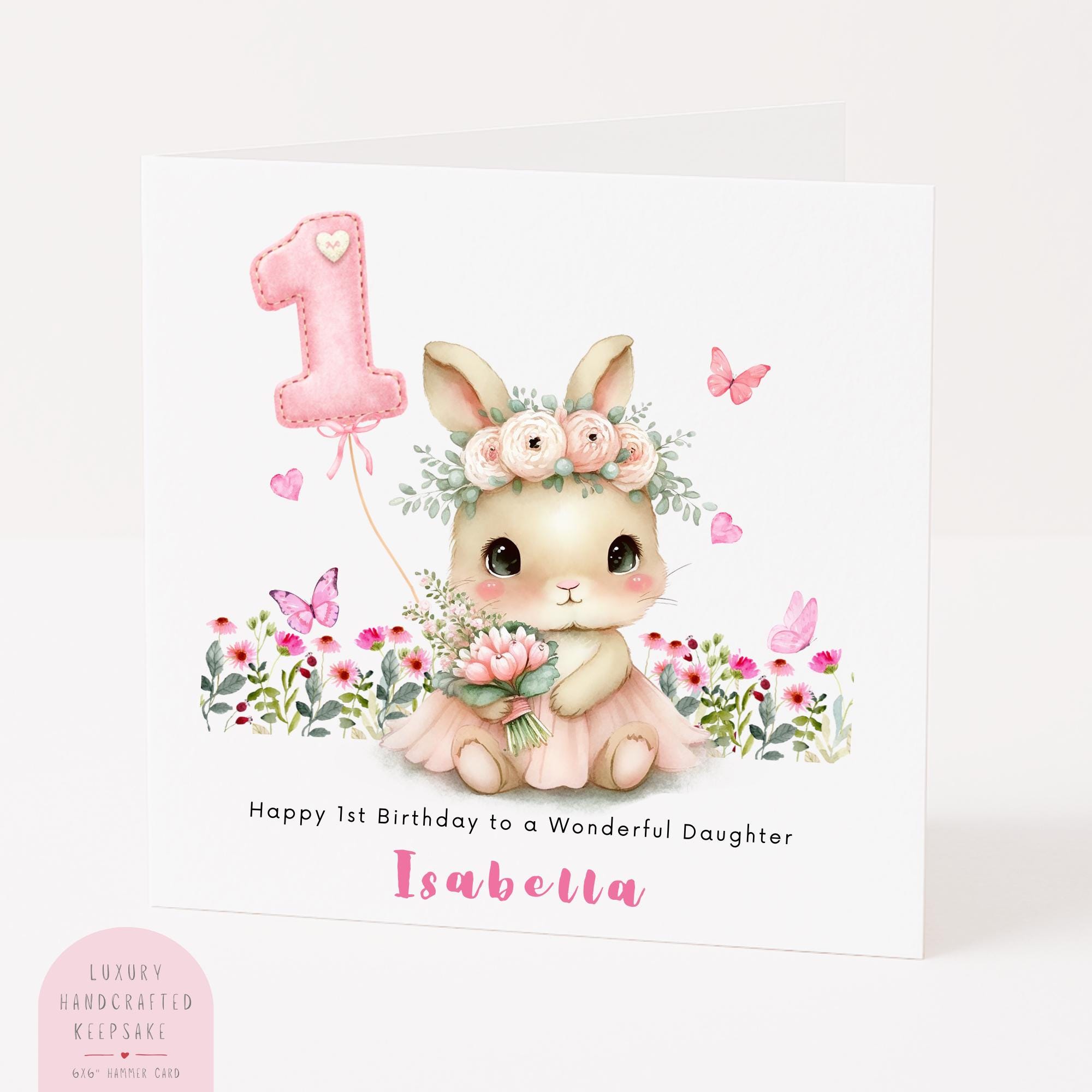 This personalised bunny wildflower birthday card is designed to celebrate your daughter’s very first birthday in a soft and meaningful way.
