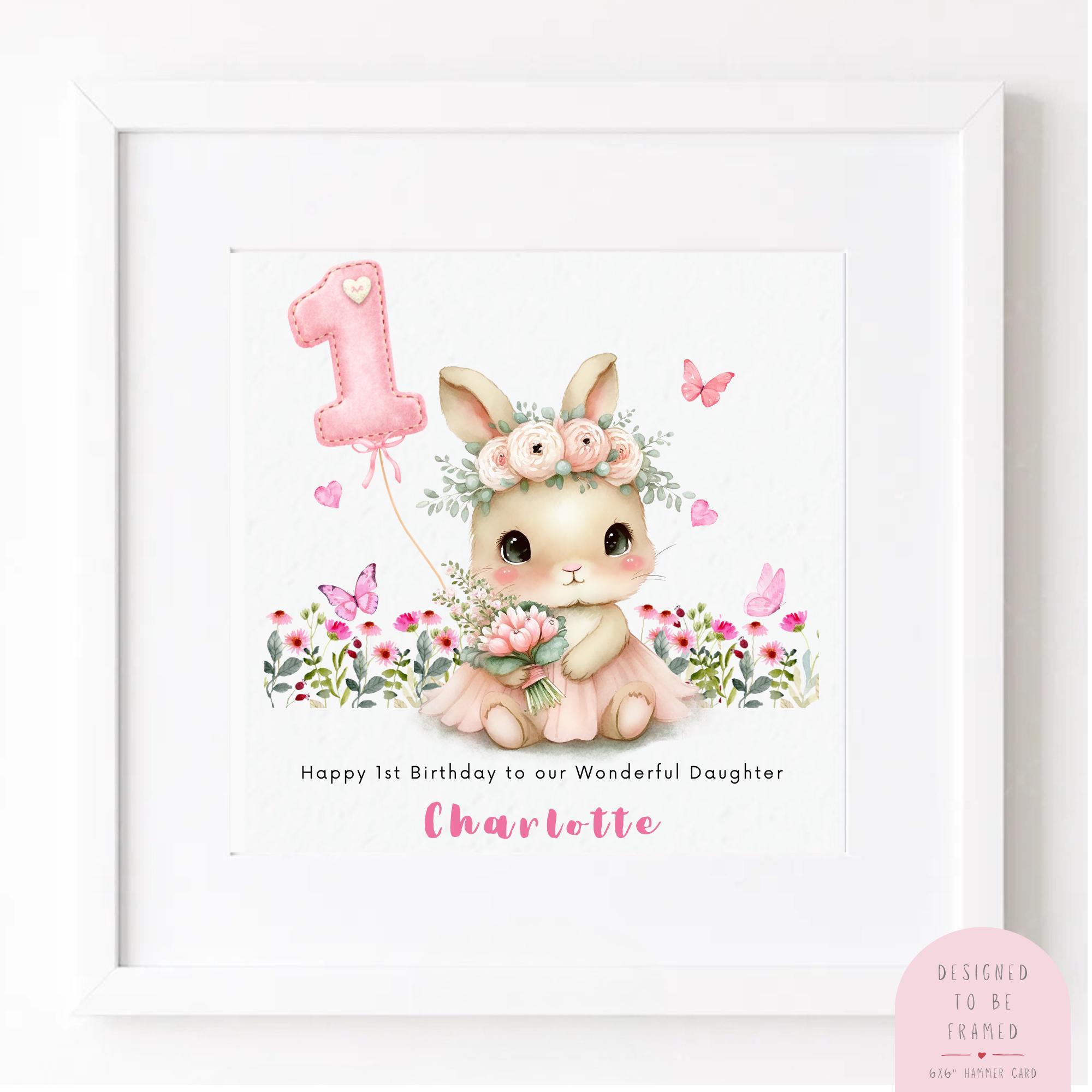 Celebrate your daughter’s very first birthday with this personalised 1st birthday card, featuring an adorable bunny surrounded by delicate wildflowers and a soft pink balloon with the word “One”.