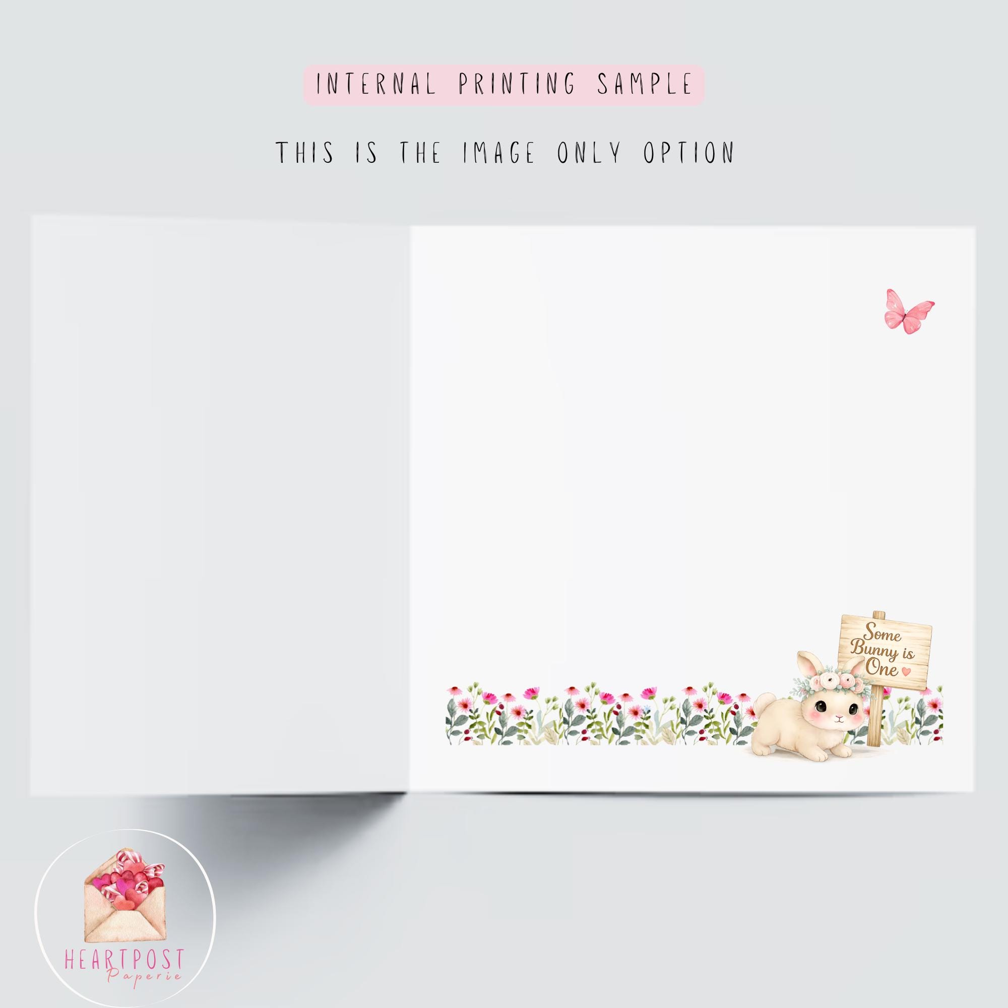 The illustration features a beautifully detailed baby bunny wearing a floral crown and a soft pink dress, holding a bouquet of flowers while sitting among blooming wildflowers and fluttering butterflies. A sweet pink balloon with “One” adds a charming and playful touch, perfectly capturing the magic of this special milestone.