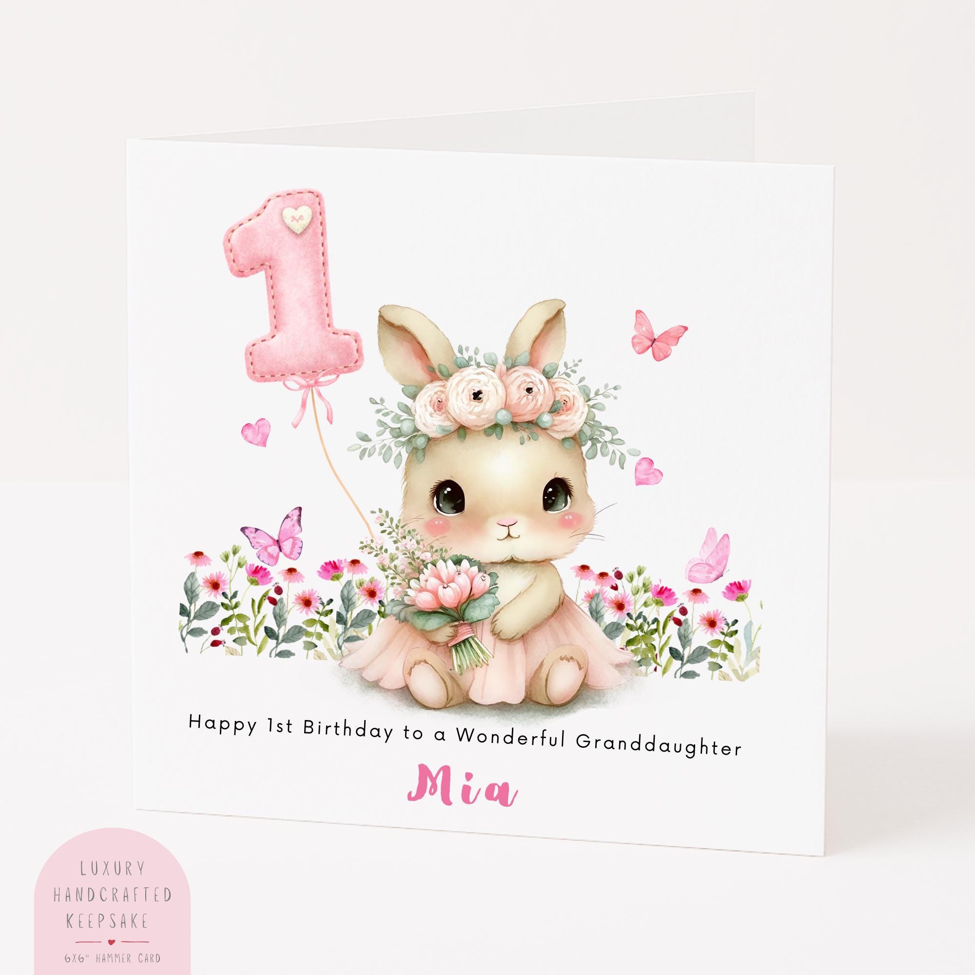 Celebrate your granddaughter’s very first birthday with this personalised 1st birthday card, featuring an adorable bunny surrounded by delicate wildflowers and a soft pink balloon with the word “One”.