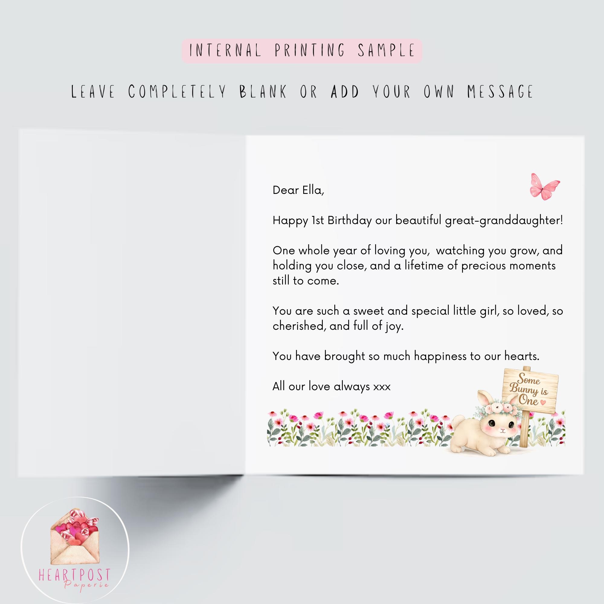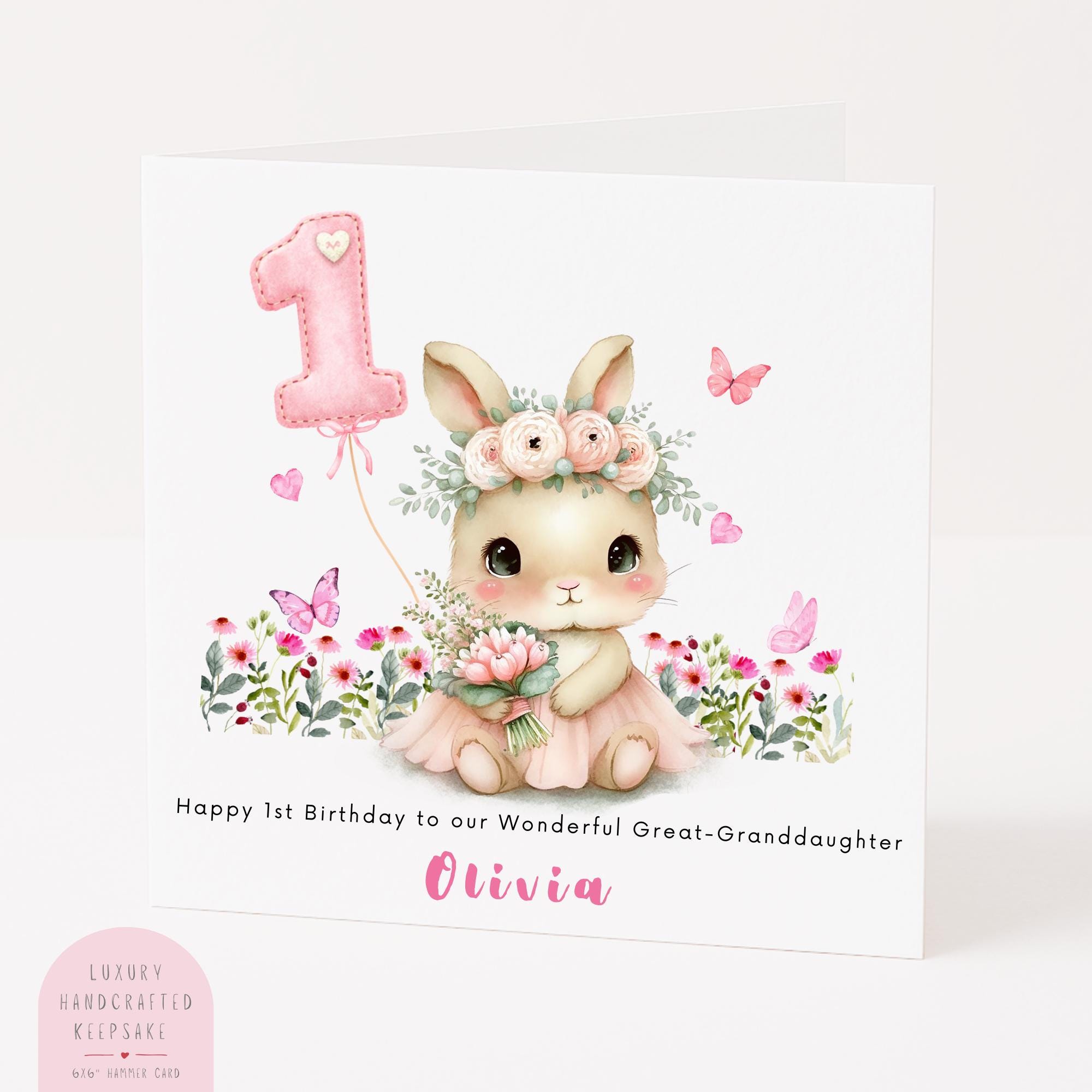 Personalised 1st Birthday Card for Great-Granddaughter – Some Bunny is One Birthday Card – Cute Bunny Floral Keepsake Card