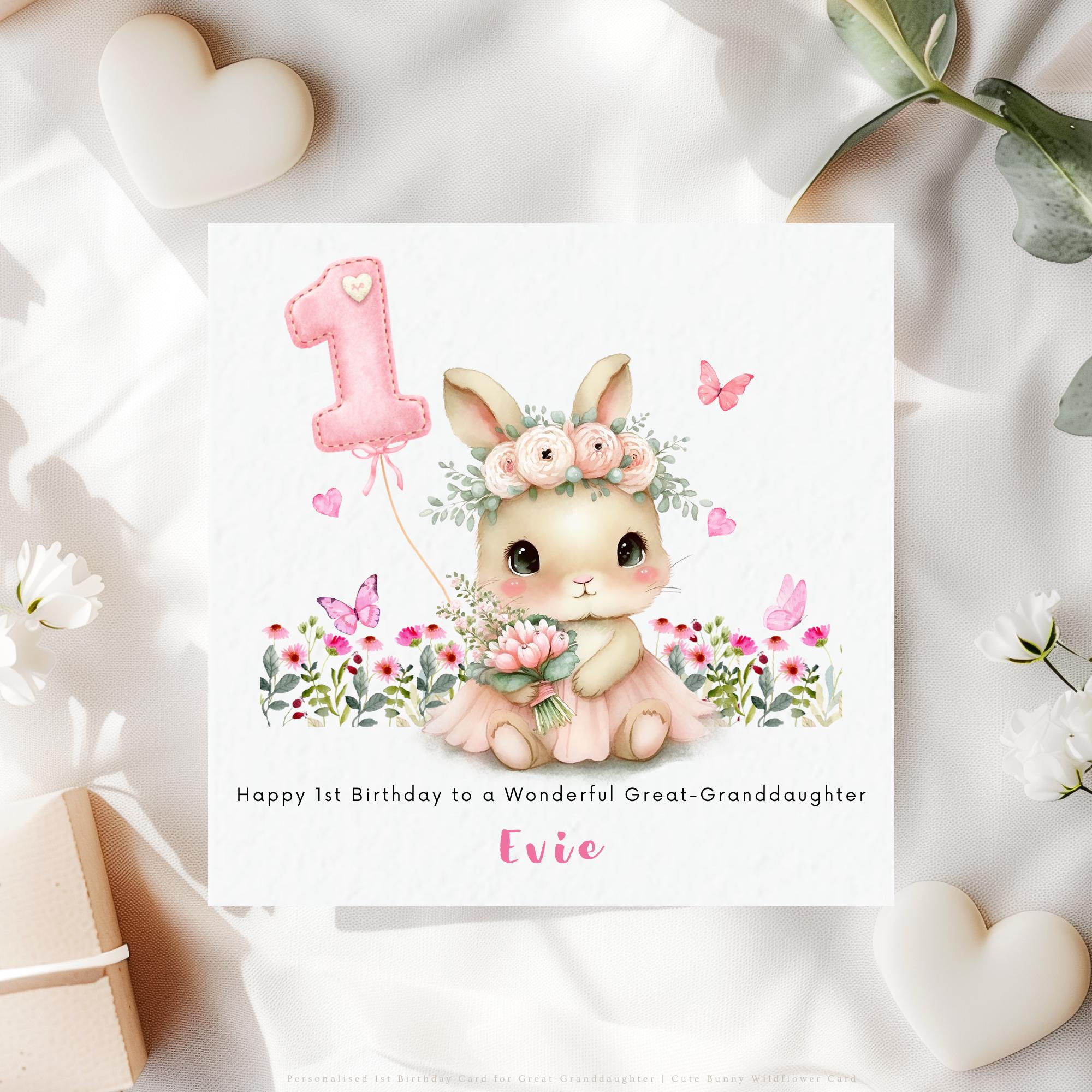 This personalised bunny wildflower birthday card is designed to celebrate your great-granddaughter’s very first birthday in a soft and meaningful way.