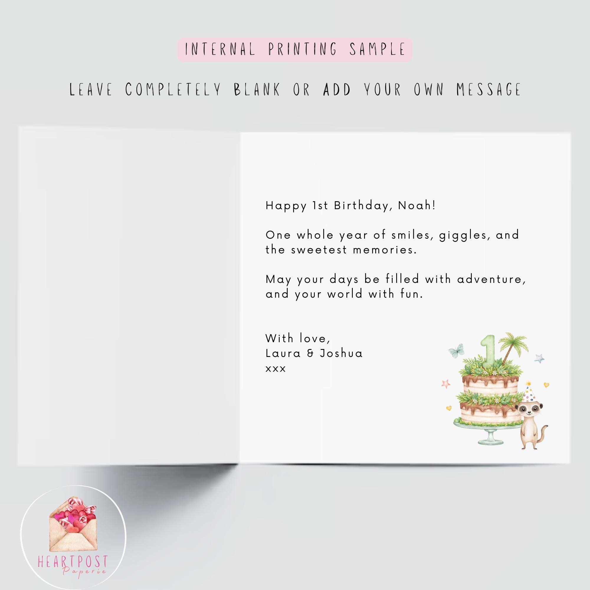 Perfect for little boys who love animals, safari adventures, and zoo themes, this personalised birthday card becomes a treasured keepsake to remember his first milestone.