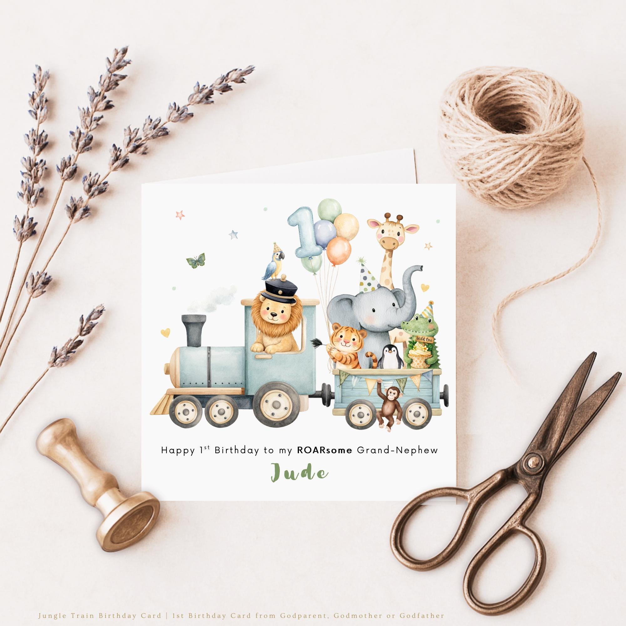 This personalised safari train birthday card is designed to celebrate a little boy’s first birthday in a fun and meaningful way.