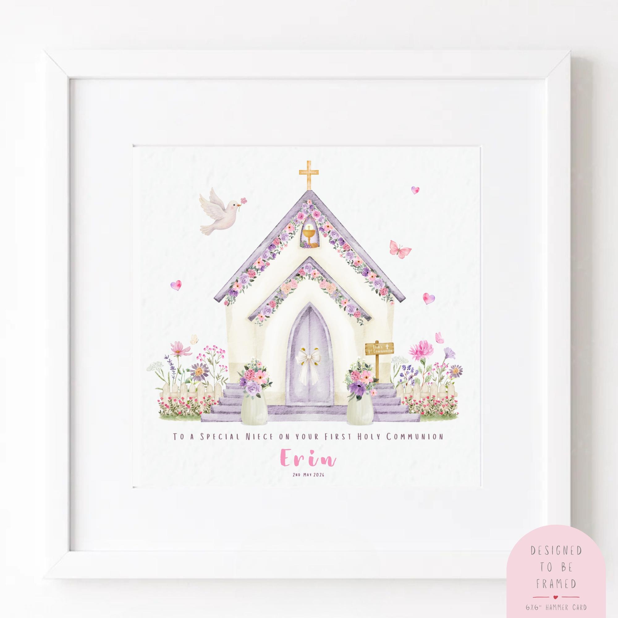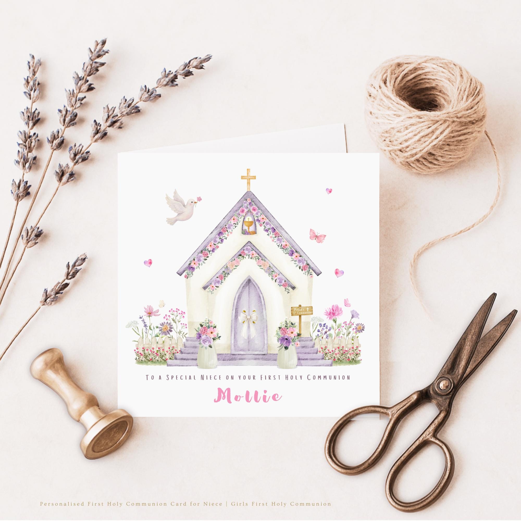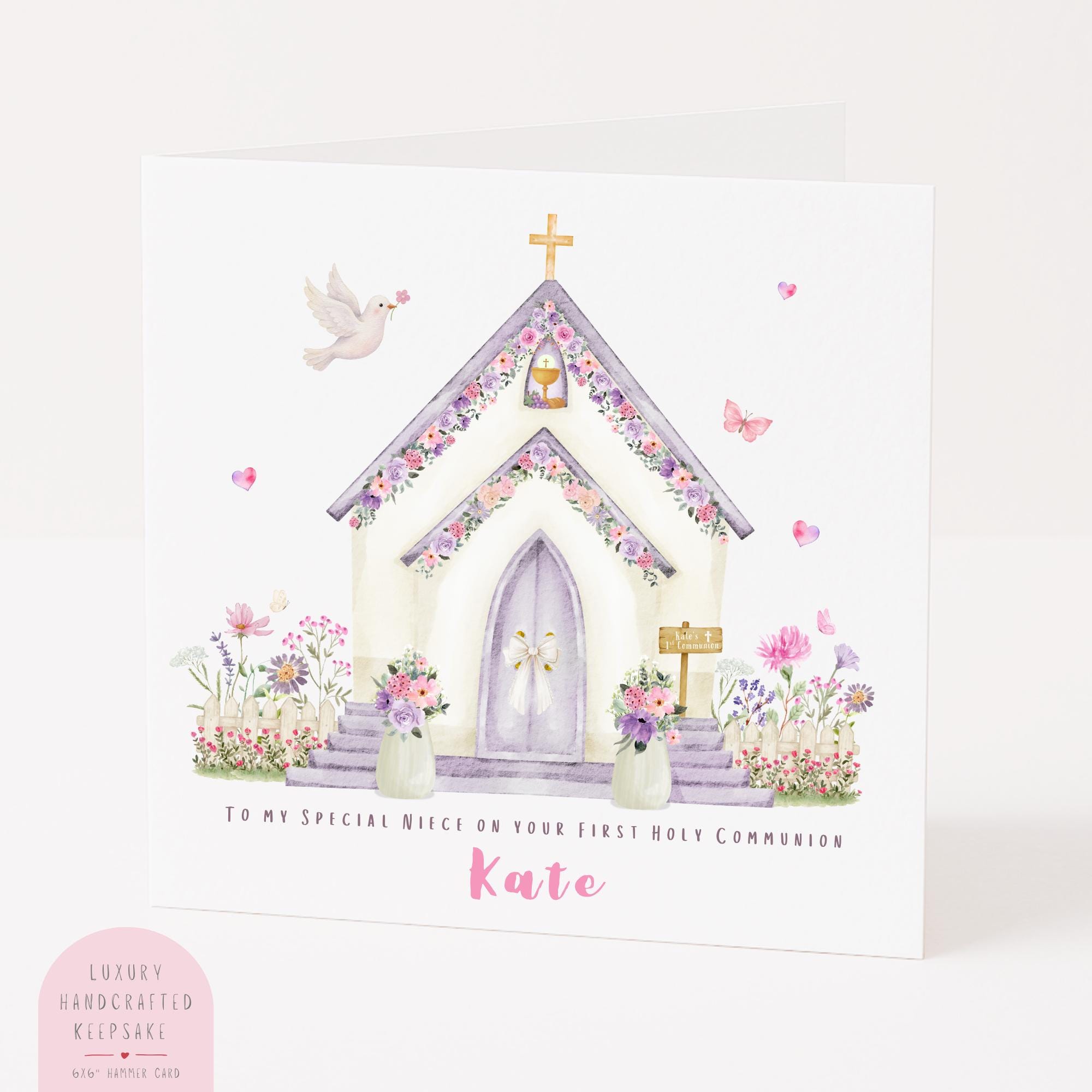 A personalised niece First Holy Communion card from an aunt or uncle, featuring a soft watercolour floral church illustration with delicate wildflowers, dove and gentle pastel pink details, thoughtfully designed to celebrate her special day in a meaningful and timeless way. Created to honour a beautiful faith milestone, this First Holy Communion card for a niece is a heartfelt keepsake she can treasure for years to come.