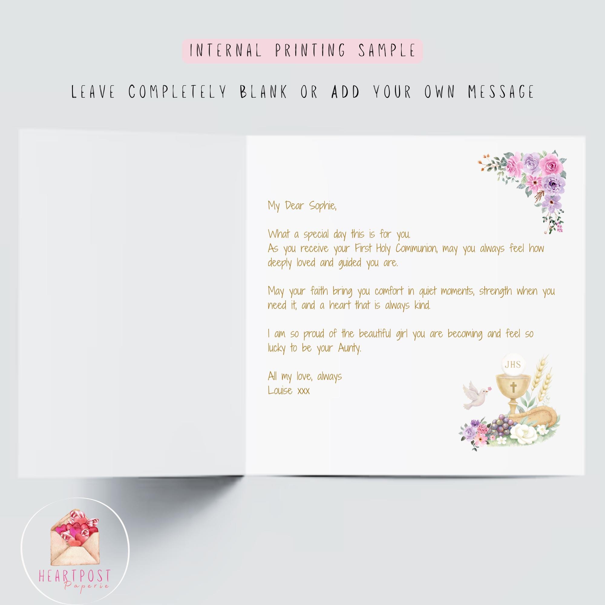 This personalised niece First Holy Communion card from an aunt or uncle is designed to celebrate faith, love, and family. A thoughtful Catholic Communion keepsake to mark this important milestone with something personal, heartfelt, and lasting.