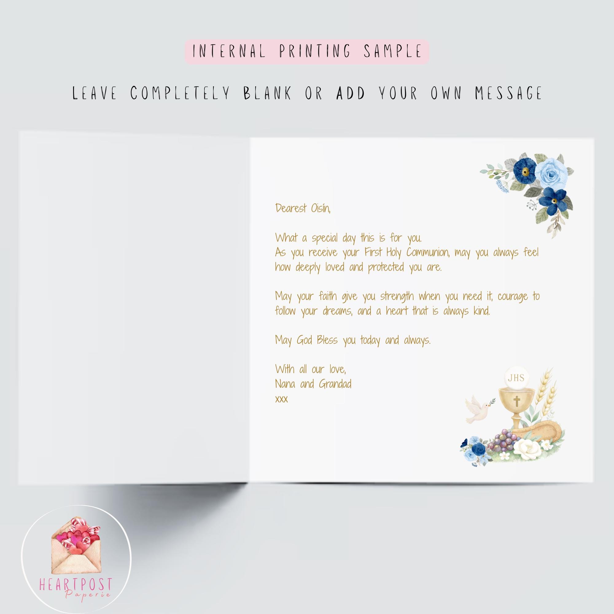 Personalised First Holy Communion Card for Grandson – From Grandparents Catholic Communion Church Card, Blue Floral Religious Keepsake