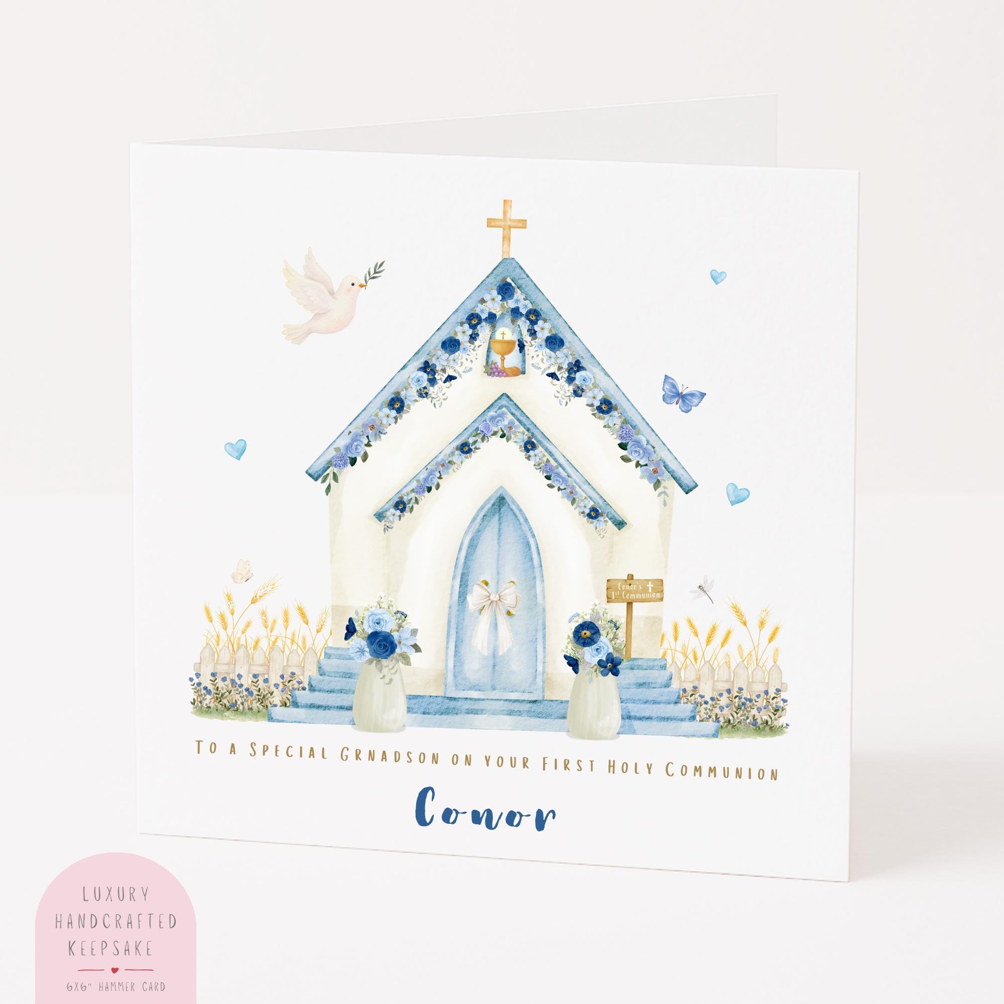 A personalised First Holy Communion card for a grandson from his grandparents, featuring a soft watercolour blue floral church illustration with delicate flowers, dove and gentle pastel tones. Thoughtfully designed to celebrate his special day, this Catholic Communion card is a meaningful keepsake to honour an important faith milestone.