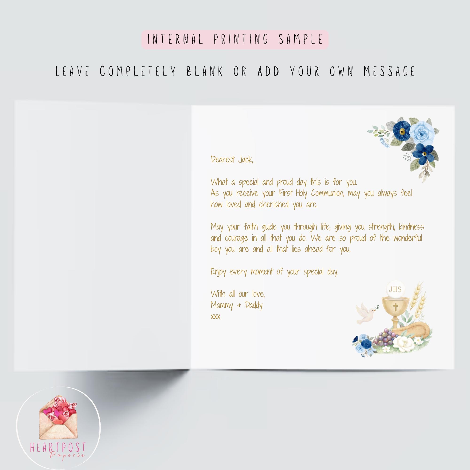 This personalised First Holy Communion card for your son, created to celebrate his faith journey with something meaningful, heartfelt, and lasting. A thoughtful Catholic keepsake to mark this important milestone with something personal, heartfelt, and lasting.