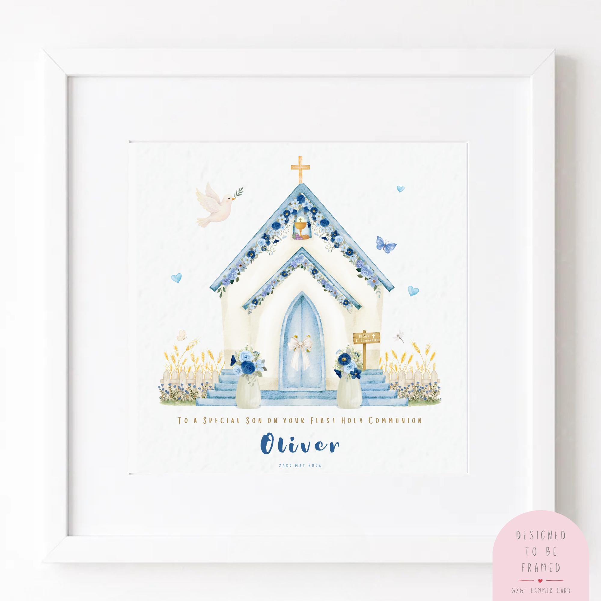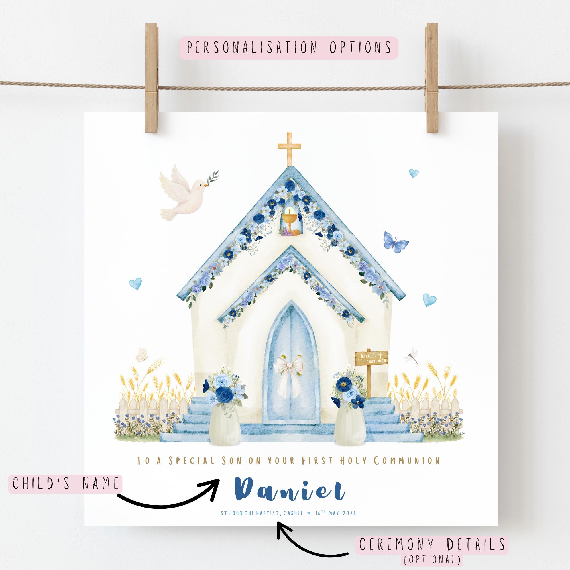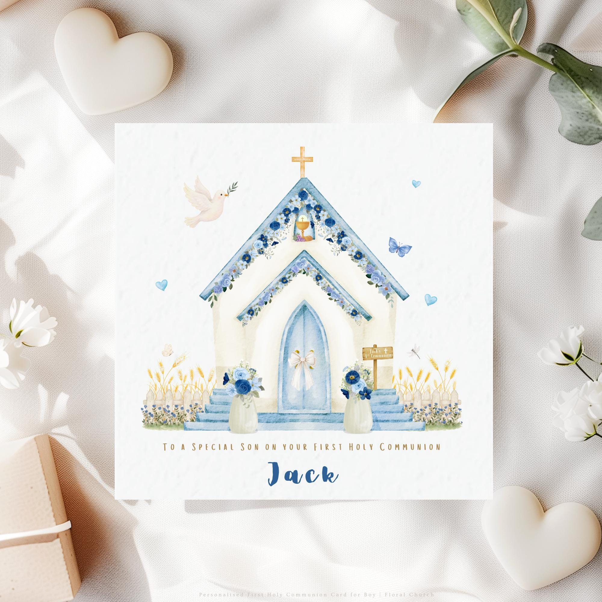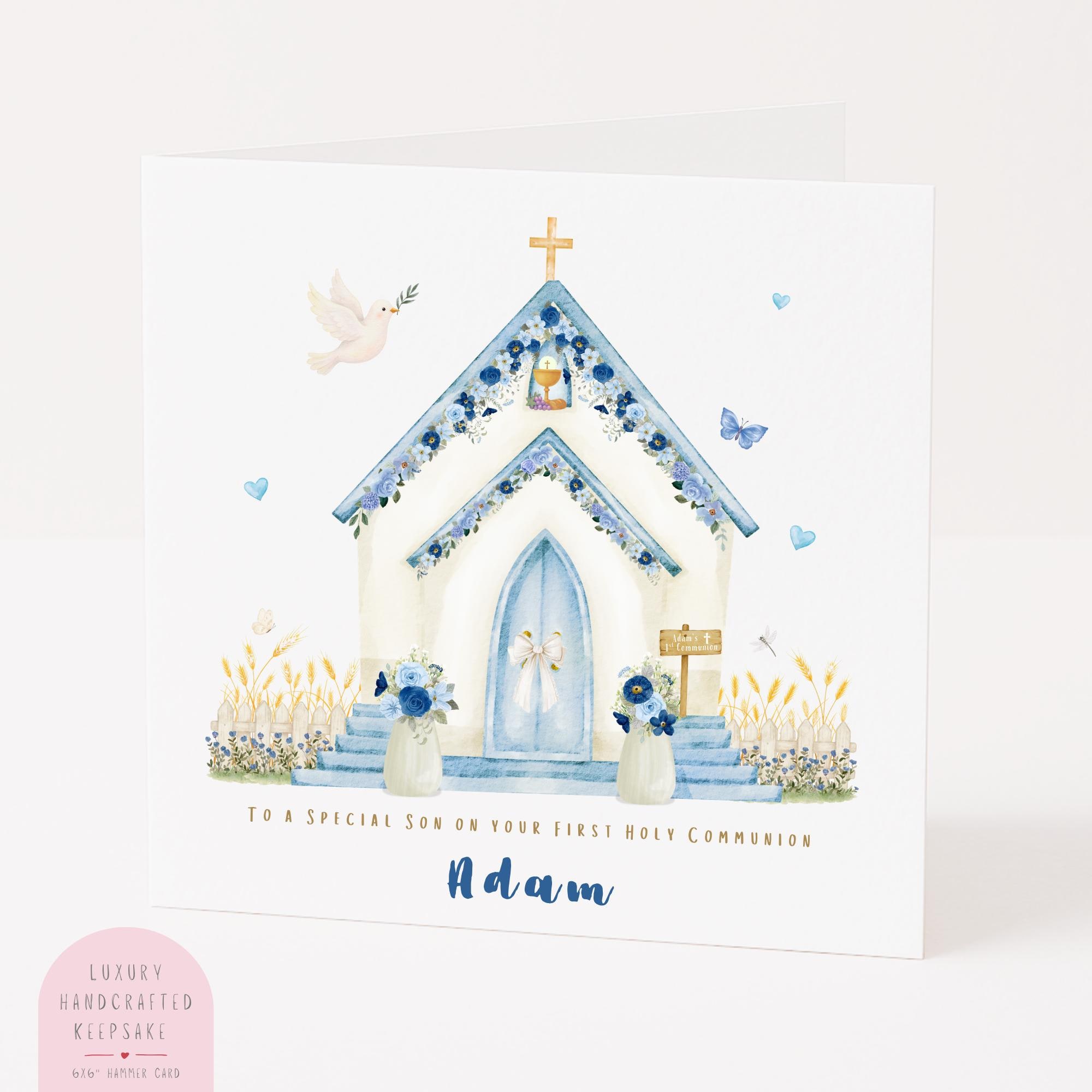 A personalised First Holy Communion card for your son, featuring a soft watercolour blue floral church illustration with delicate flowers, dove and gentle pastel tones. Thoughtfully designed to celebrate his special day, this Catholic Communion card is a meaningful keepsake to honour such an important faith milestone.