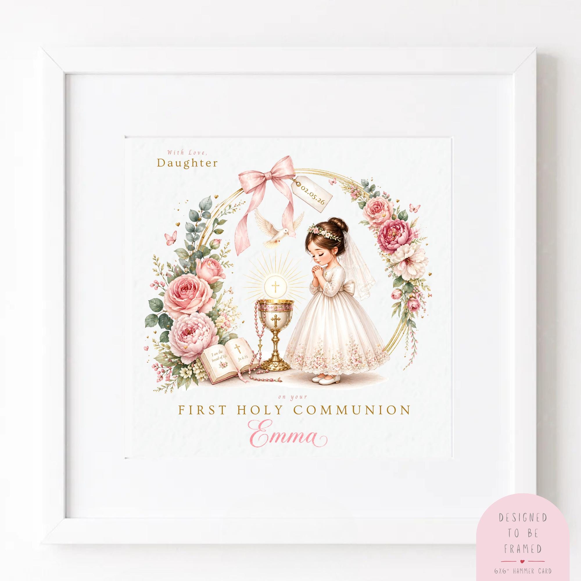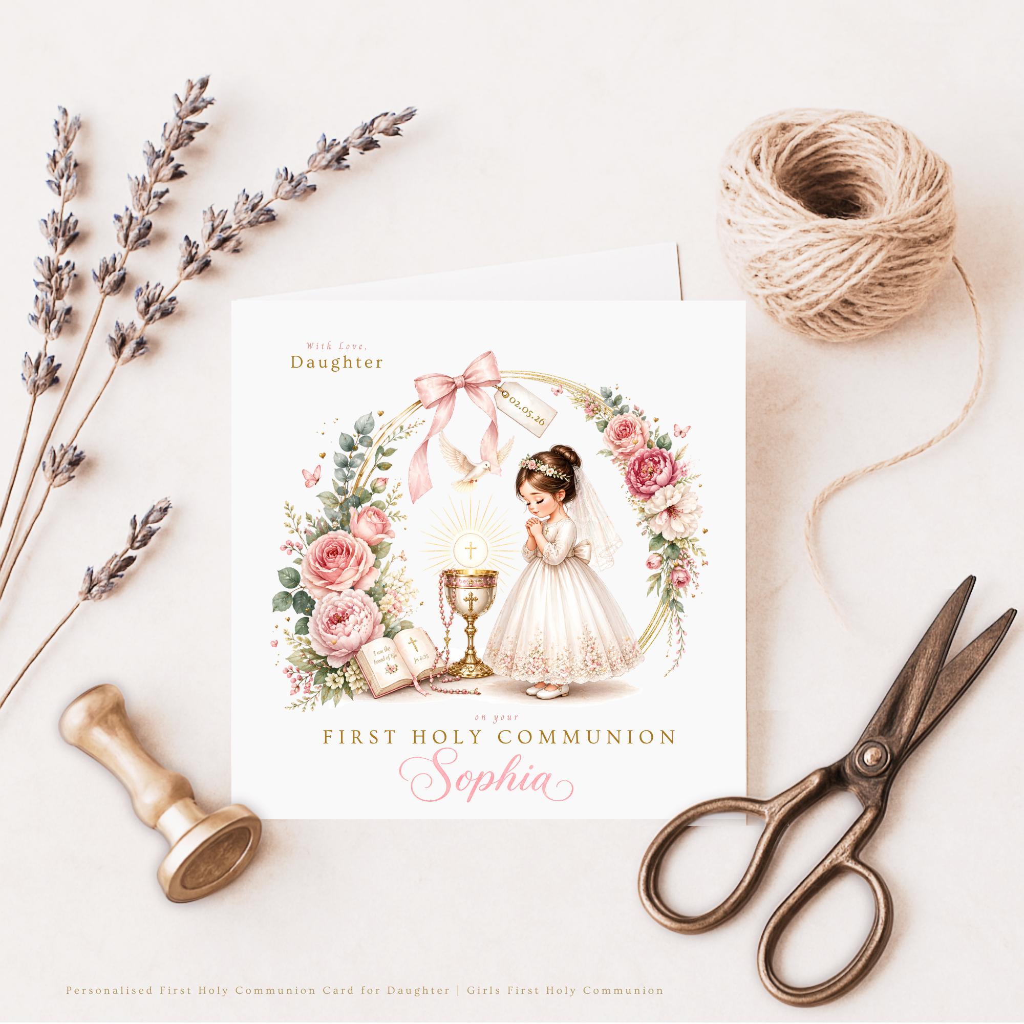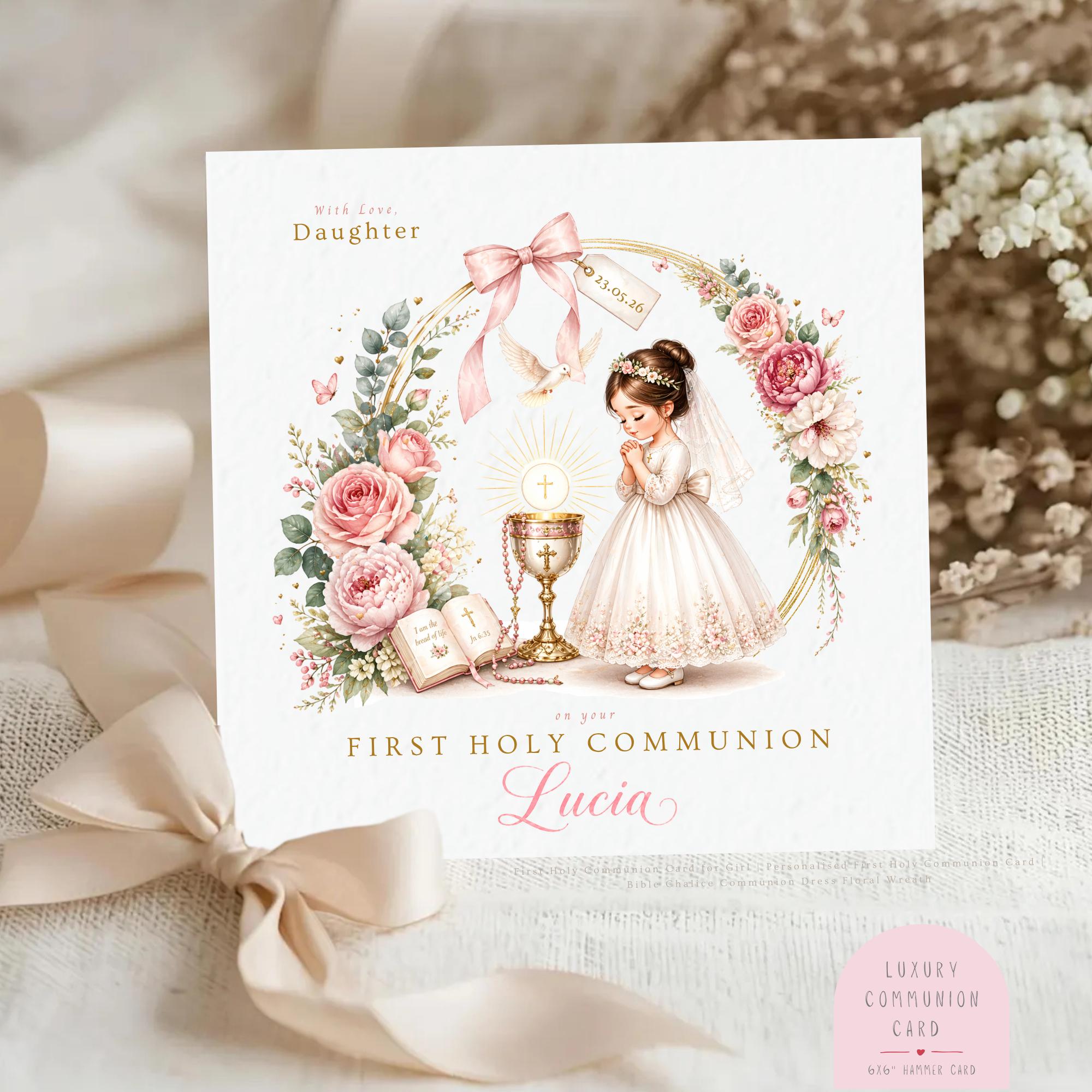 Personalised First Holy Communion Card for Daughter from Parents, Catholic Communion Card for Girl, Custom Hair Colour Communion Keepsake Card with Praying Girl, Floral Wreath, Chalice and Eucharist