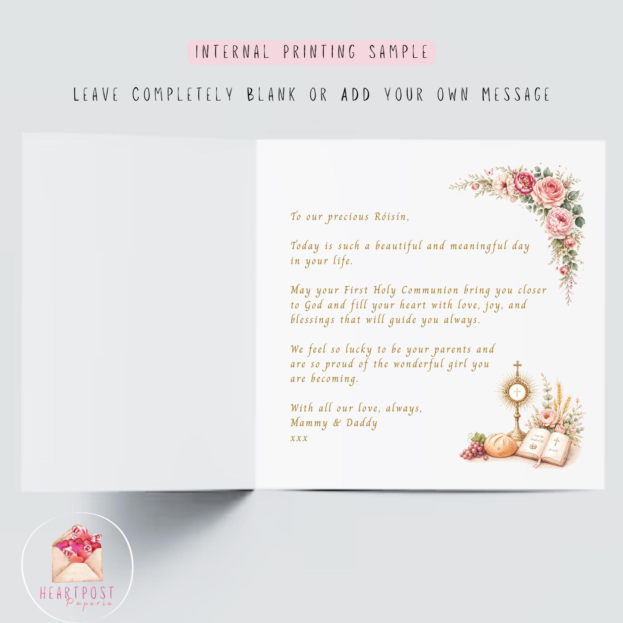 Celebrate your daughter’s special sacrament with this personalised First Holy Communion card for daughter from parents, a meaningful Catholic Communion keepsake card for girl designed to honour this important moment in her faith journey.