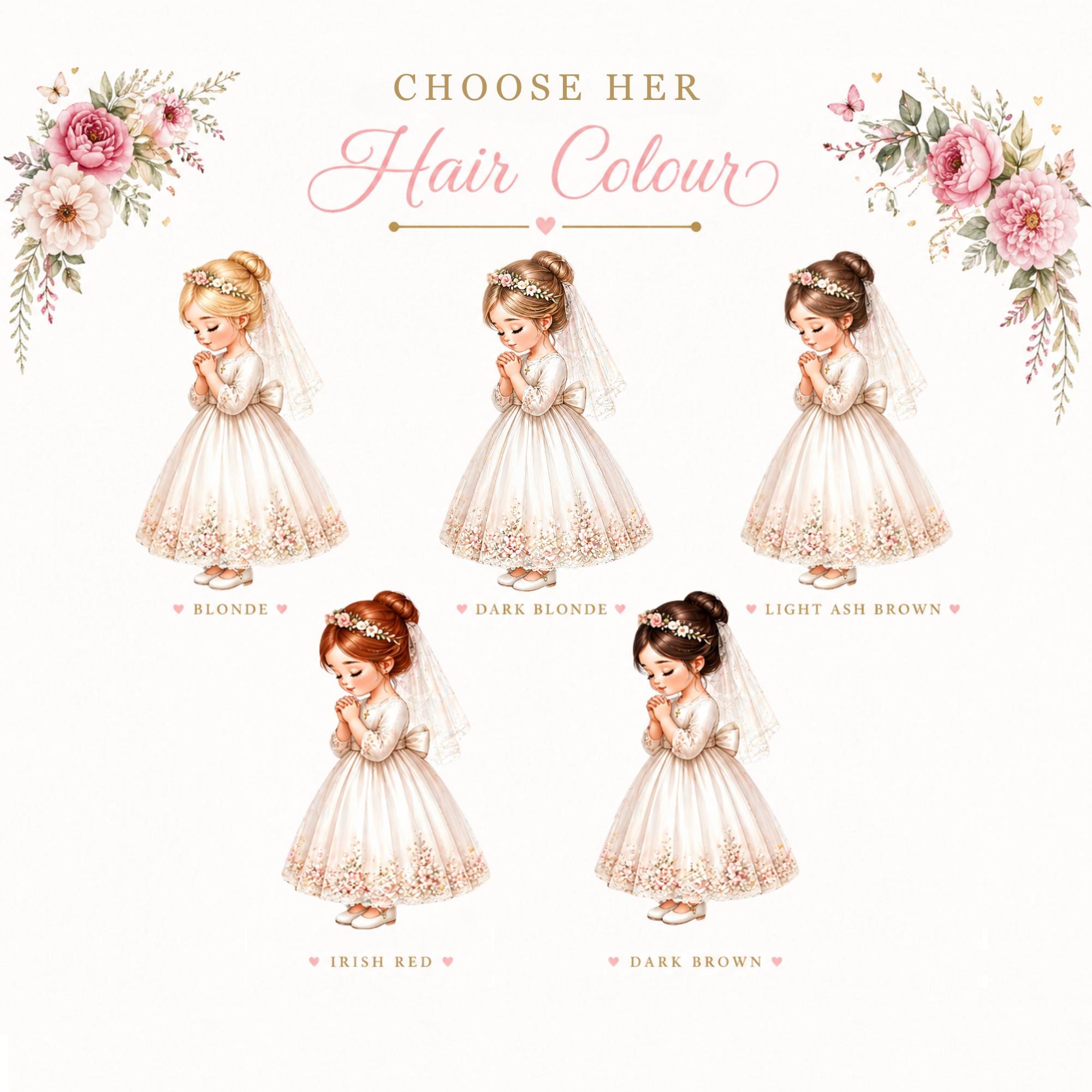 To make the card truly personal, the illustration includes custom hair colour options, along with your niece’s name and optional ceremony details. This creates a unique personalised First Communion keepsake card for niece, thoughtfully designed to reflect her on this important day.