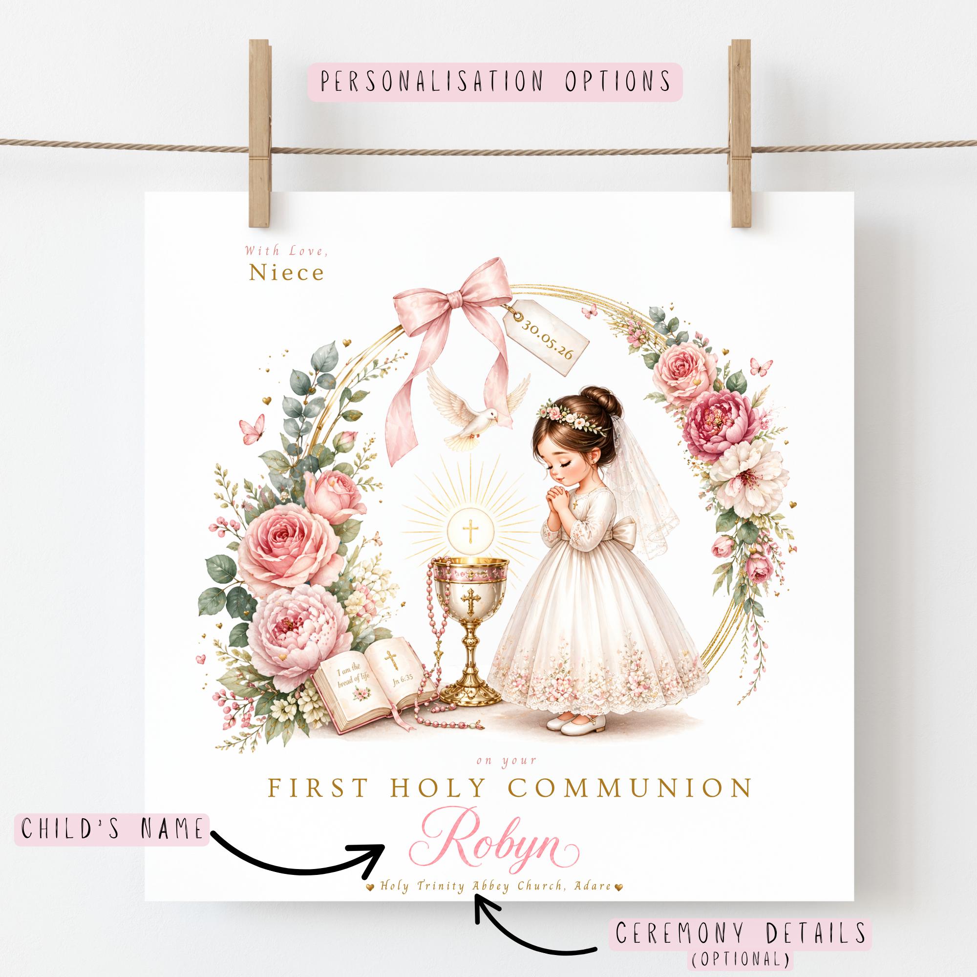 Personalised First Holy Communion Card for Niece, Catholic Communion Card for Girl, Custom Hair Colour Communion Keepsake Card with Praying Girl, Floral Wreath, Chalice and Eucharist