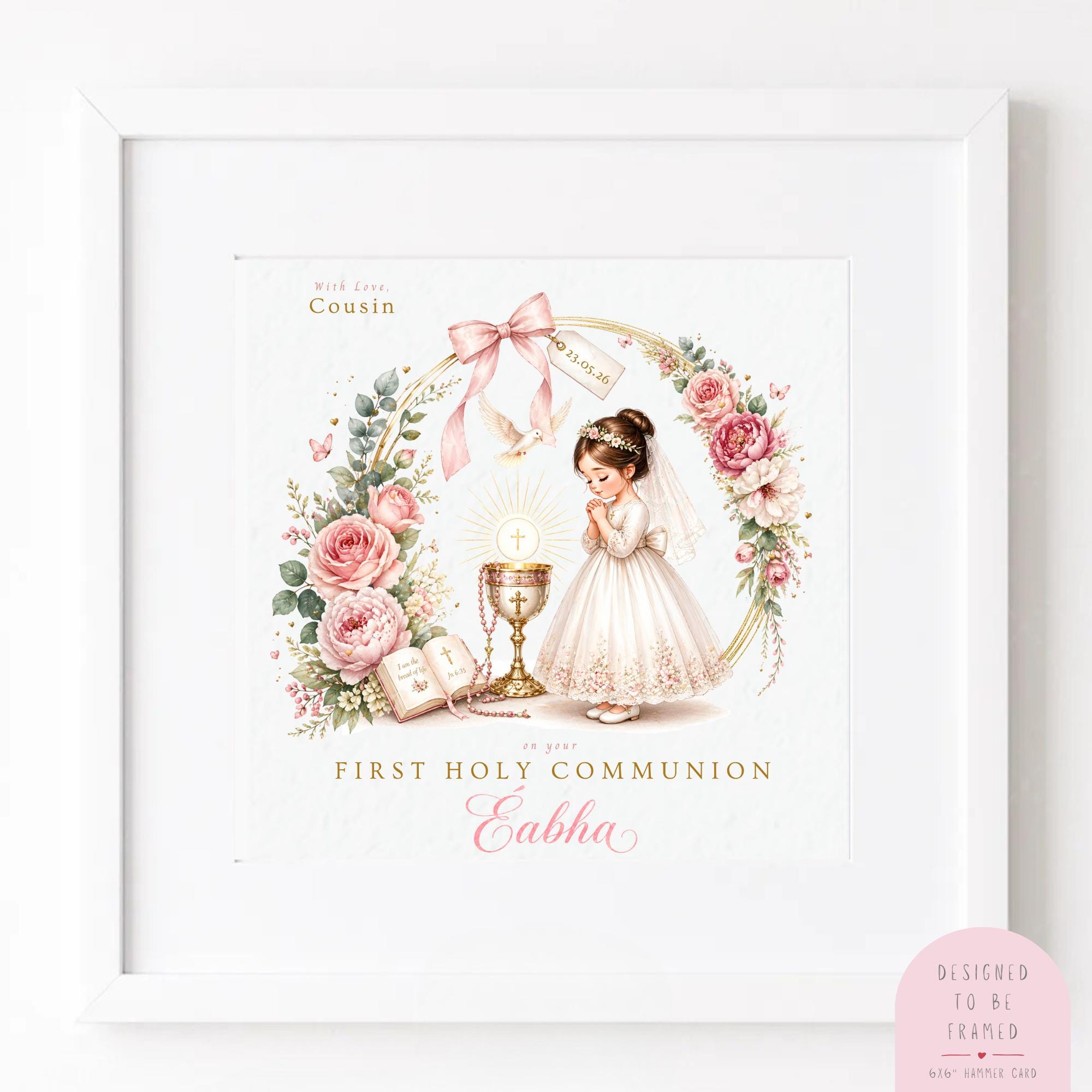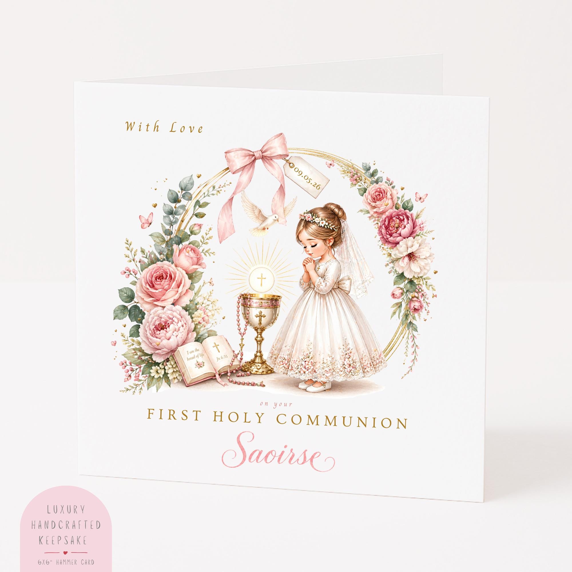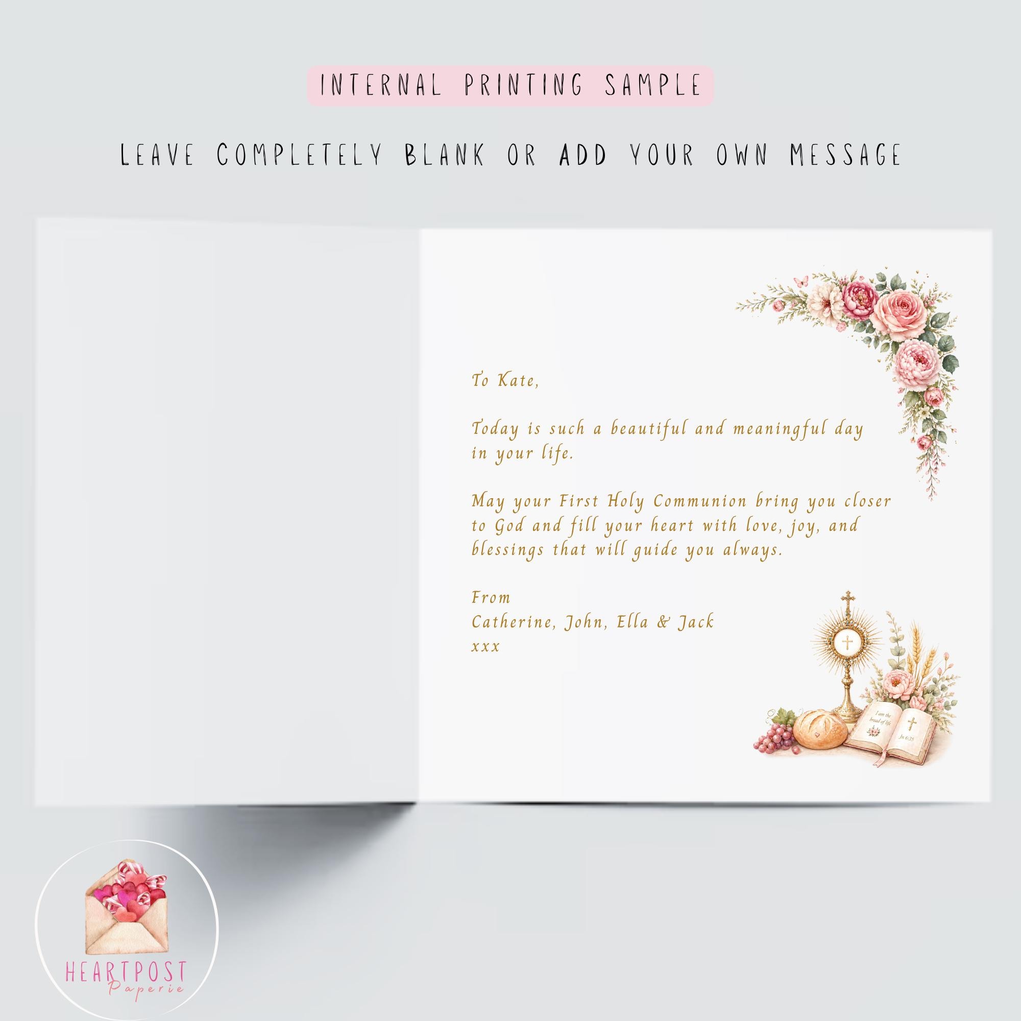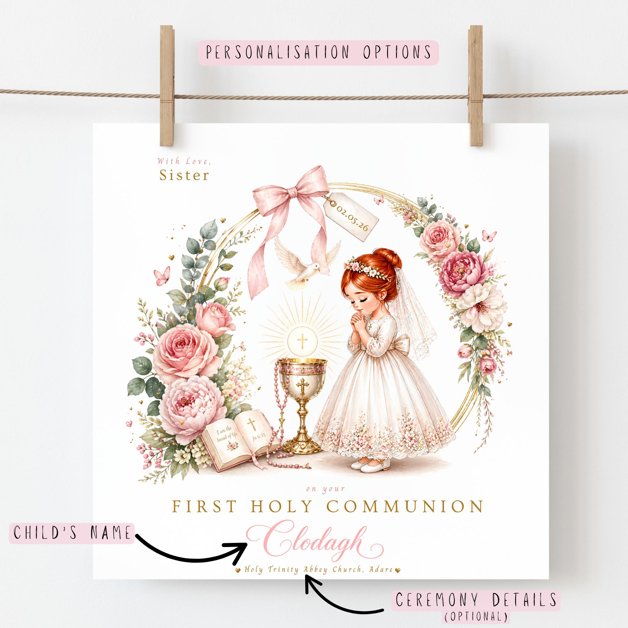 Celebrate her special sacrament with this personalised First Holy Communion card for girl, a meaningful Catholic Communion keepsake designed to honour this important moment in her faith journey.
