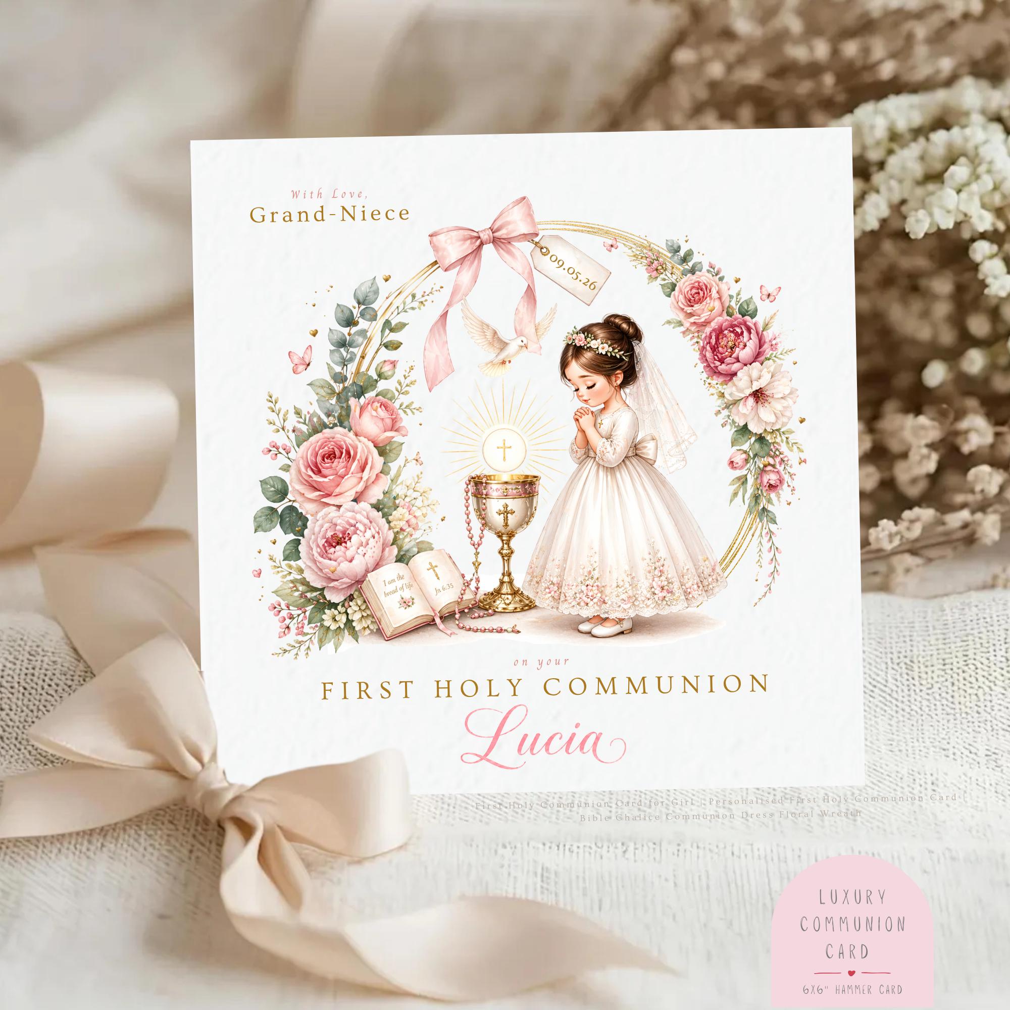 Personalised First Holy Communion Card for Girl, Catholic Communion Card, Custom Hair Colour Communion Keepsake Card with Praying Girl, Floral Wreath, Chalice and Eucharist